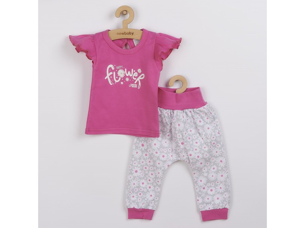 2-dielna súpravička českej značky New Baby Happy Flower pre bábätká. Obsahuje tričko a tepláčiky. Tričko zdobí nápis Happy flower a šmrncovné volánikové rukávy. Zapínanie na cvoček pri krčku na zadnej strane. Tepláčiky majú širší lem, sú zúžené na nohavičkách s lemom a sú celopotlačené kvetinkami. Zloženie: 100% bavlna.Dodatočné parametre
