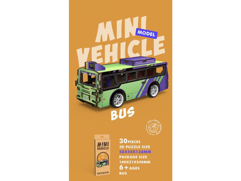 3D puzzle drevené - Autobus. Rozmery 14x5,4x5,8 cm. 30 dielikov. Na spätné natiahnutie.Dodatočné parametre