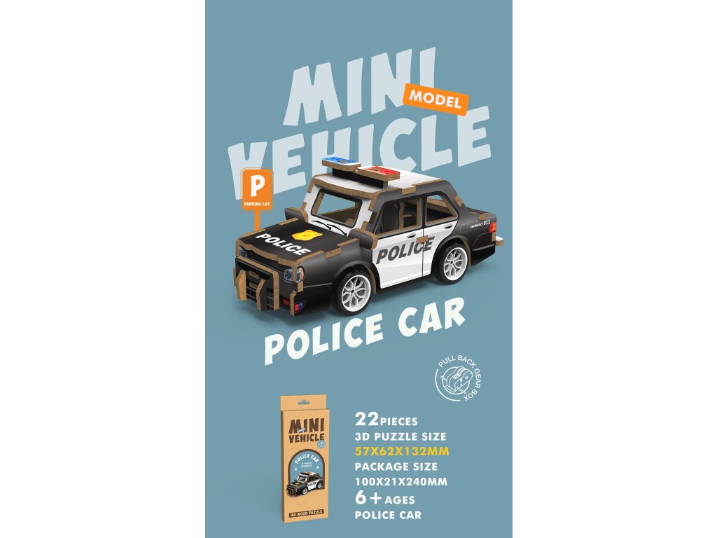 3D puzzle drevené - Policajné auto. Rozmery 13x6,2x5,7 cm. 22 dielikov. Na spätné natiahnutie.Dodatočné parametre