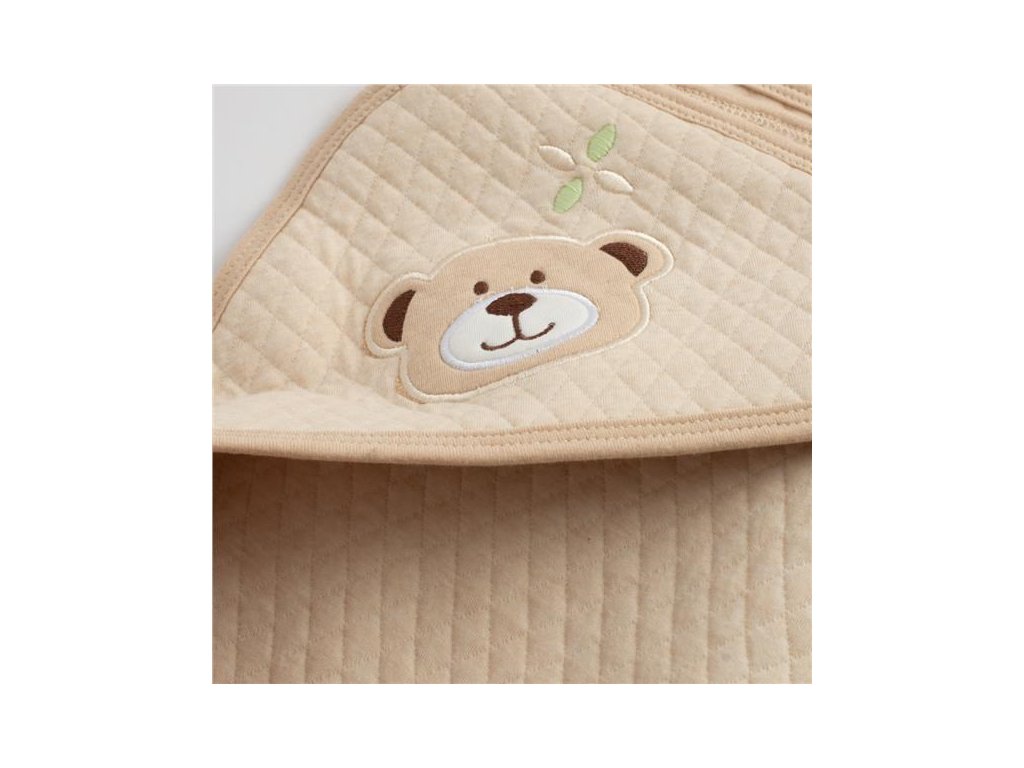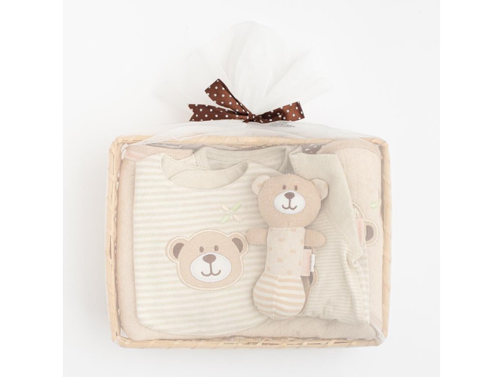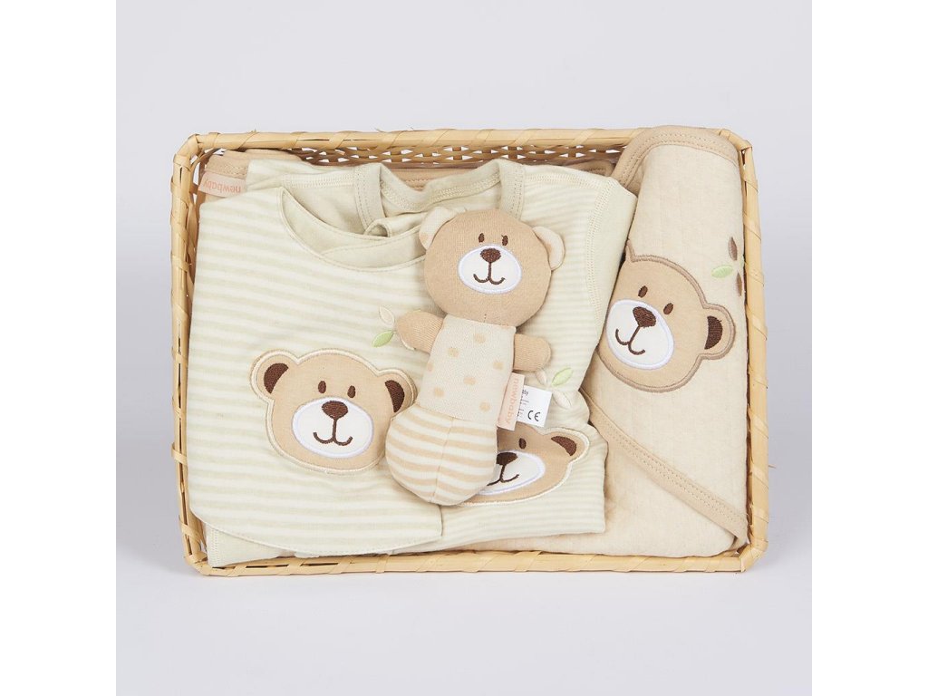 Krásny darčekový set z organickej bavlny českej značky New Baby. Set sa skladá z overálku, podbradníka, dečky s kapucňou a hračky. Všetky časti sú zdobené nášivkou medvedíka. Dojčenský overálek bez šľapiek ukončený pružným lemom má bočné zapínanie na cvočky po celej dĺžke. Podbradník je možné zapnúť do 2 veľkostí. Zapínanie je na 2 cvočky. Dečka s kapucňou je veľmi príjemná na dotyk a praktická kapucňa chráni hlavičku dieťatka pred chladom. Po celom obvode má dečka kvalitné lemovanie. Možno využiť aj ako osušku. Hračka s hrkálkou a pískatkom priláka pozornosť dieťaťa, učí ho, baví a rozvíja tak detskú fantáziu. Vhodné pre deti od prvých dní života. Nádherný a kvalitný set je dodávaný v prútenom košíčku, štýlovo zabalený tylovou tkaninou a mašľou, ktorá všetko luxusne podčiarkne. Set je vhodný aj ako milý darček.