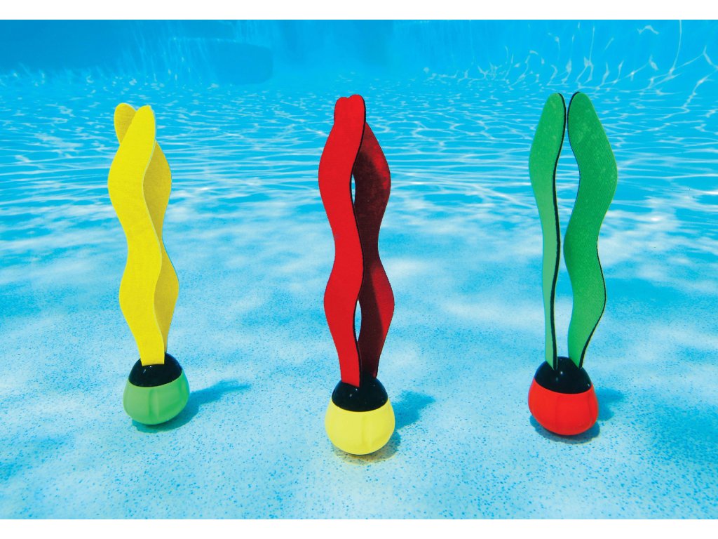 Loptičky so stužkou na potápanie. Loptička sa po vhodení do bazéna postaví na jeho dno a deti môžu precvičovať potápanie. 3 ks v balení, vhodné pre deti od 6 rokov, vyrobené z mäkkého plastu a materiál stužky je textilný. Dĺžka celkom 19 cm, v 3 farebných prevedeniach.Dodatočné parametre