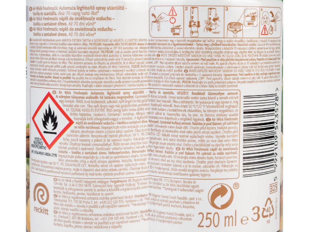 Pred vložením aerosólu do difuzéra sa presvedčte, že je difuzér vypnutý: nastavenie “OFF”. Pred zapnutím, difuzér natočte smerom od vašej tváre. Po zapnutí difuzéra dôjde po 15 sekundách k automatickému uvoľneniu vône. Upozornenie: Podrobne si prečítajte pokyny pre bezpečné zaobchádzanie pred použitím výrobku. Z bezpečnostných dôvodov, postupujte starostlivo podľa pokynov na použitie automatického strojčeka Air Wick Freshamtic. Nestriekajte na potraviny, tkaniny, povrchy. Zasiahnutý povrch zotrite vlhkou handrou. Upozornenia a Pokyny pre bezpečné zaobchádzanie: Pred použitím si prečítajte údaje na štítku. Pozorne čítajte a dodržujte inštrukcie na aerosólovej náplni. Ak je potrebná lekárska pomoc, majte poruke obal alebo štítok výrobku. Uchovávajte mimo dosahu detí. Chráňte pred teplom, horúcimi povrchmi, iskrami, otvoreným plameňom a inými zdrojmi zapálenia. Zákaz fajčenia. Neprepichujte alebo nespaľujte ani po použití. Chráňte pred slnečným žiarením. Nevystavujte teplote presahujúcej 50 °C/122 °F. Nestriekajte do otvoreného ohňa alebo iných zdrojov zapálenia. PRI ZASIAHNUTÍ OČÍ: Niekoľko minút opatrne oplachujte vodou. Vyberte kontaktné šošovky, ak sú nasadené a pokiaľ ich možno vybrať ľahko. Pokračujte vo vyplachovaní. Osoby s precitlivenosťou na vône by mali tento výrobok používať s opatrnosťou. Osviežovače vzduchu nemôžu nahradiť správnej hygieny.