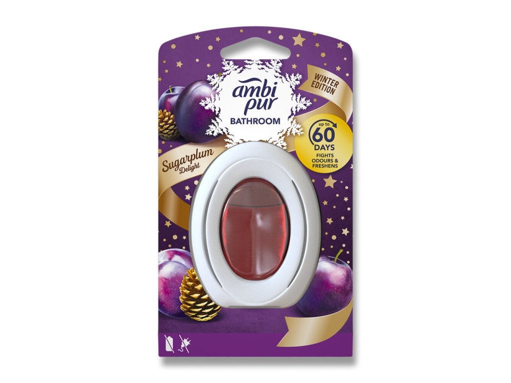 Doprajte svojej kúpeľni luxusný nádych s osviežovačom vzduchu Ambi Pur Bathroom vo vôni Sugarplum Delight . Táto jemná, sladko ovocná vôňa sa postará o to, aby vaša toaleta a kúpeľňa boli vždy svieže a príjemné – bez nepríjemných pachov. Vďaka technológii OdourClear™ neutralizuje zápachy namiesto toho, aby ich len prekrýval. Kompaktné balenie vydrží až 60 dní a vďaka diskrétnemu dizajnu sa hodí do každého interiéru. Jednoduché použitie bez potreby batérií alebo elektriny.