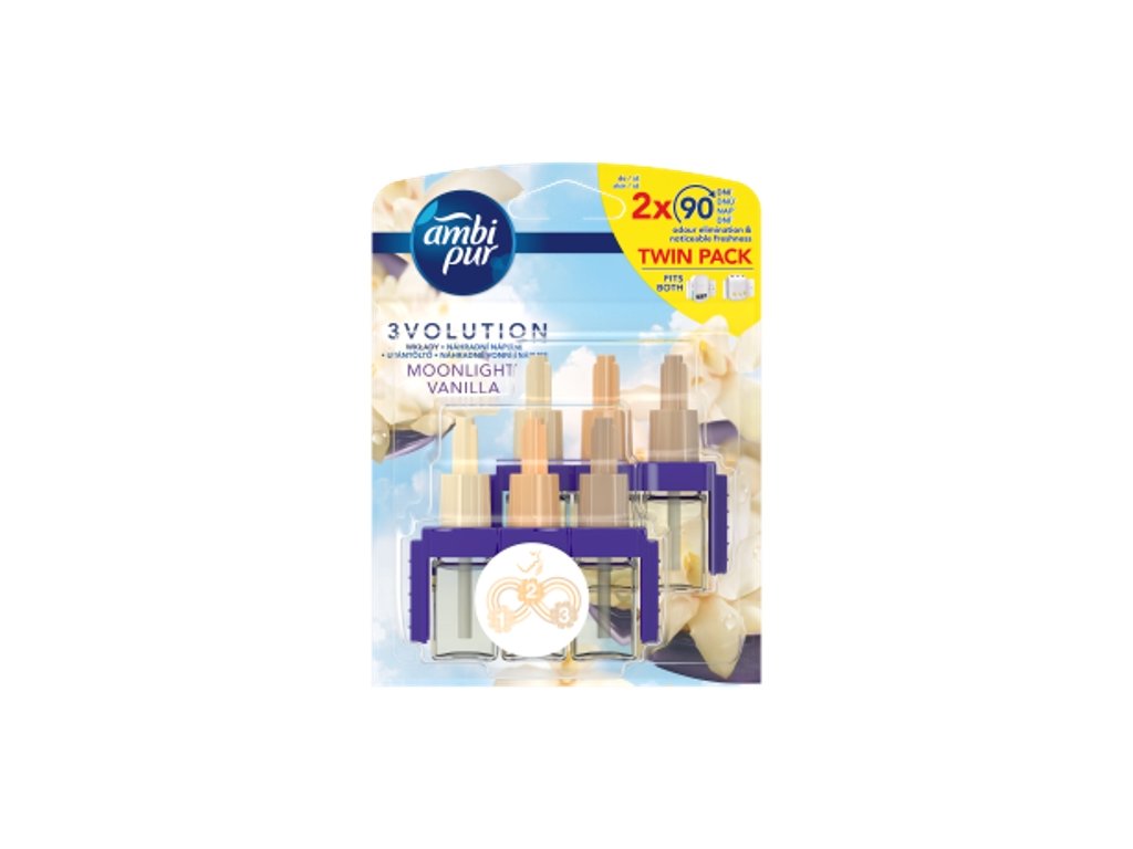 Ambi Pur 3Volution Infinity Moonlight Vanilla nepretržite odstraňuje pachy a strieda 3 vzájomne sa doplňujúce vône pre sviežosť, ktorú budete vnímať. Vydrží až 90 dní (pri používaní 12 hodín denne s nastavením najnižšej úrovne odparovania). Objavte krásu Moonlight Vanilla teraz s 2x väčším účinkom v porovnaní s našimi bežnými osviežovačmi vzduchu: Intenzívnejšia vôňa s väčším dosahom naplní miestnosť vôní. Vanilla vytvára príjemnú atmosféru svojou jemnou vanilkovou vôňou. Vôňa inšpirovaná atmosférou vašich obľúbených kaviarní zachytáva pravú arómu speneného mlieka a intenzívnu vôňu vanilky. Vnímajte pokoj, ktorý vás obklopí, keď sa vzduch naplní touto čistou a decentnou vôňou. U bežných elektrických osviežovačov si na vône rýchlo zvykneme a prestaneme ich vnímať. Osviežovač vzduchu Ambi Pur 3Volution sviežosť obnovuje tým, že sa každých 45 minút automaticky striedajú 3∘vzájomne sa doplňujúce, vysoko kvalitné vône. Náplne Ambi Pur 3Volution používajte s odparovacím strojčekom 3 Volution, aby ste naplnili váš domov sviežosťou a vôňou, ktorú budete vnímať deň čo deň, týždeň čo týždeň. 3Volution taktiež umožňuje nastaviť intenzitu odparovania vône a tak vám pomôže vytvoriť požadovanú atmosféru.