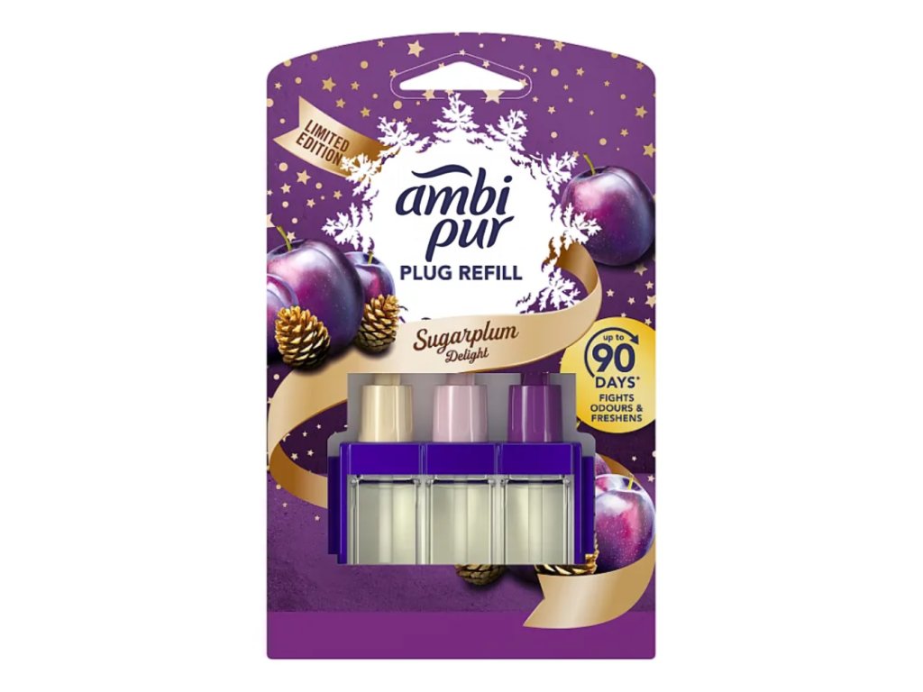 Ambi Pur 3volution náhradné náplne 20 ml Sugarplum Delight pre odparovací elektrický strojček Ambi Pur 3volution. Trojkombinácia vôní sladkej slivky prevonia váš domov alebo kanceláriu jedinečnou vôňou až po dobu 90 dní. Z miestnosti odstráni nepríjemné pachy a vzduch príjemne prevonia vianočnou vôňou, ktorá sa po 45 minútach mení, navzájom sa doplňujúcimi tromi vôňami. Na vône, ktoré nás obklopujú si rýchlo zvykneme a môžeme ich prestať vnímať. Ambi pur 3volution je jedinečný osviežovač vzduchu, ktorý svojou technológiou nemá konkurenciu a vôňa pravidelne mení. Balenie obsahuje iba náplne Ambi Pur 3volution, nie elektrický strojček elektrický strojček Ambi Pur 3volution.