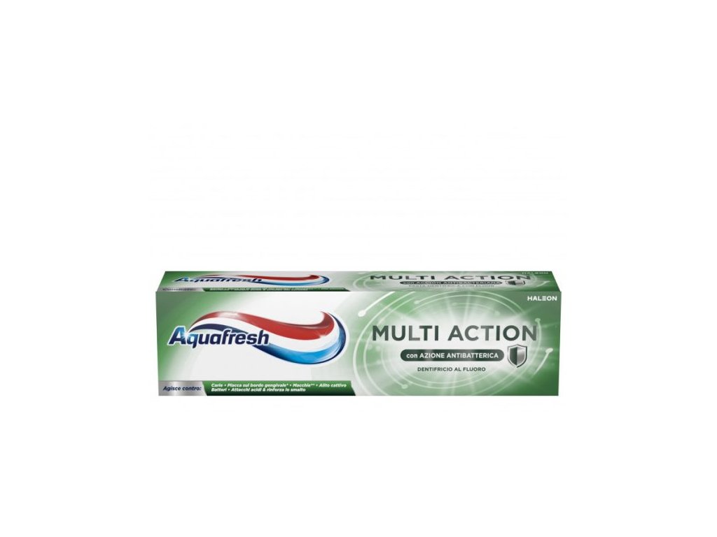 Aquafresh Multi Action je zubná pasta, ktorá poskytuje komplexnú starostlivosť o vaše zuby a ústnu dutinu. Táto zubná pasta ponúka viacúčelovú ochranu – chráni pred vznikom zubného kazu, odstraňuje povlak, bojuje proti zápachu z úst a pomáha s prevenciou zubného kameňa.