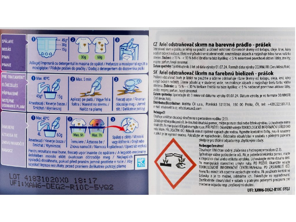 Funkce: | Odstraňování skvrn bez poškození, bělicí účinek, šetrnost k vláknům. |