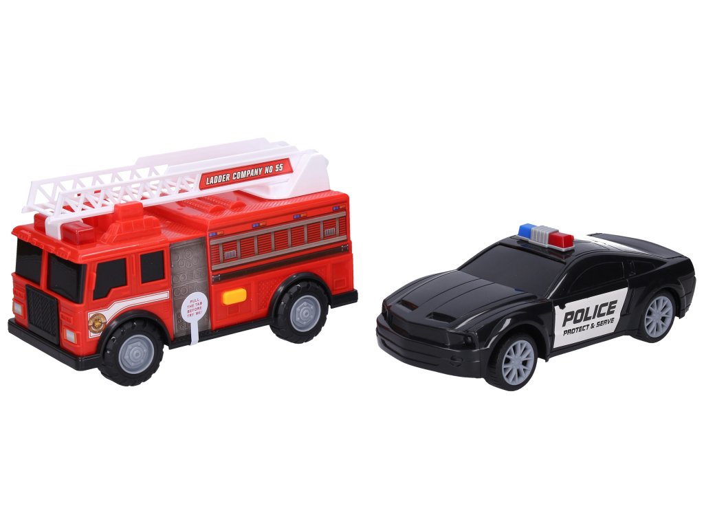 Autá policajné a hasičské s efektmi. Veľkosť 23 cm. Voľné kolesá. Svetelné a zvukové efekty tlačidlom na streche policajného auta a tlačidlom na ľavom boku hasičského auta. 2xAG13 batérie pre každé auto (4xAG13 celkom), súčasťou.Dodatočné parametre