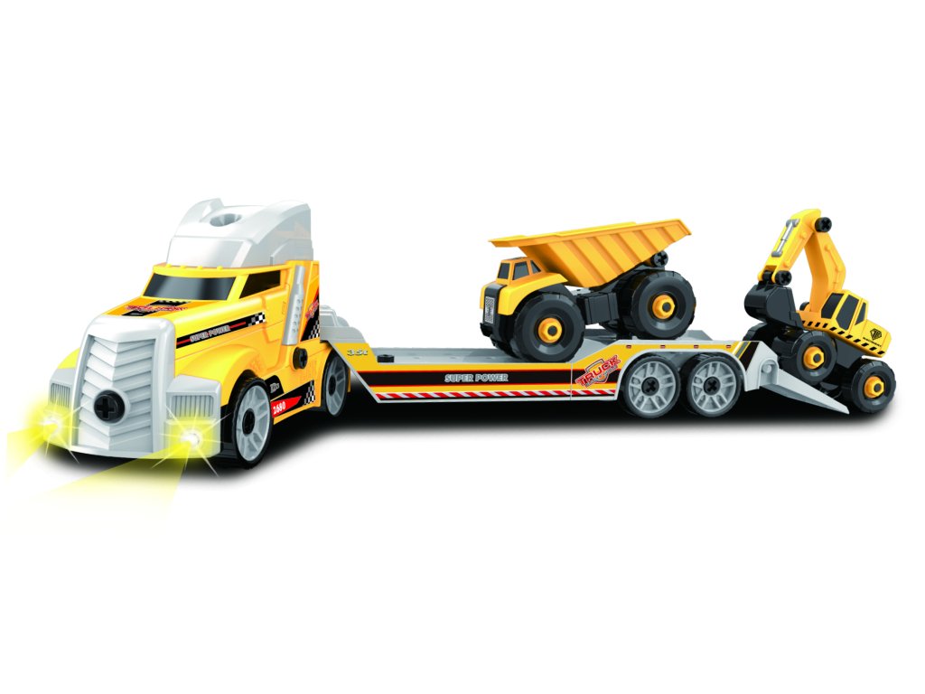 Rozmery ťahača 62x10x15 cm. Voľné kolesá. Balenie obsahuje ťahač a 2 stavebné stroje 16 cm (sklápač, bager), krížový skrutkovač (v rukoväti je kľúč na matice). Vydáva svetelné a zvukové efekty. Aktivácia efektov sa vykonáva ON/OFF prepínačom na spodnej strane ťahača.Dodatočné parametre