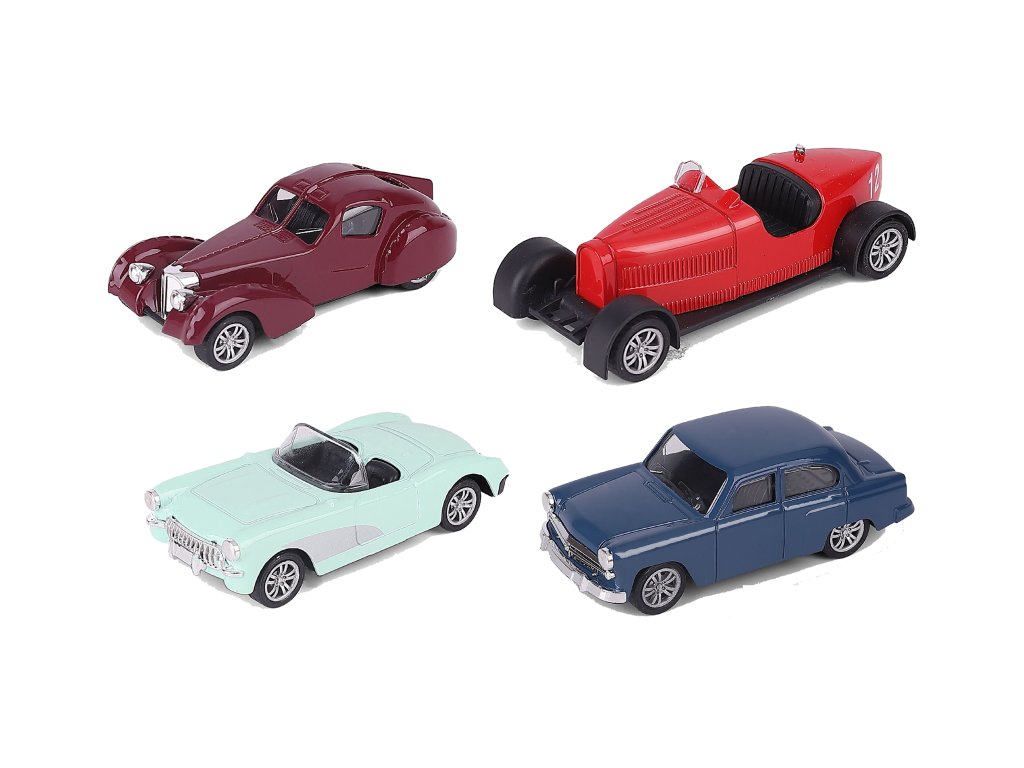 Auto veterán na spätné natiahnutie, kovové. Rozmery 10,5x4,5x2,8 cm. Display box 24 ks. 4 varianty - červená, zelená, modrá, hnedá.Dodatočné parametre