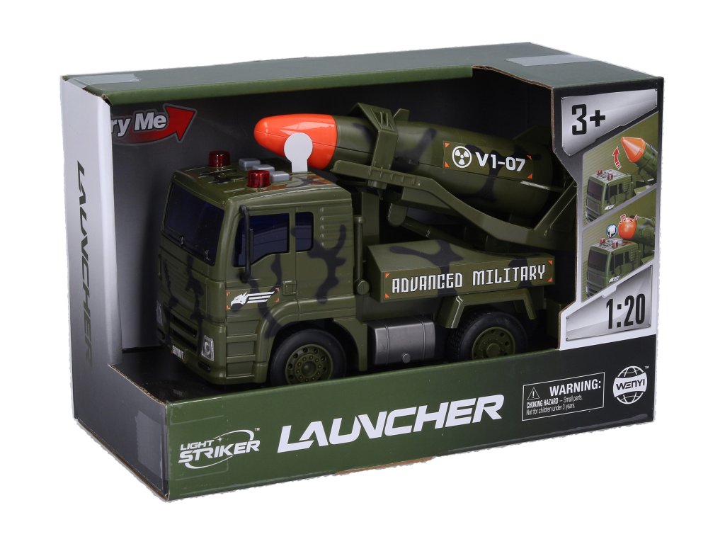 Auto vojenské s raketou. Veľkosť 19 cm. Na zotrvačník. Svetelné a zvukové efekty tlačidlami na kabíne auta. 3xAG13 batérie súčasťou.Dodatočné parametre