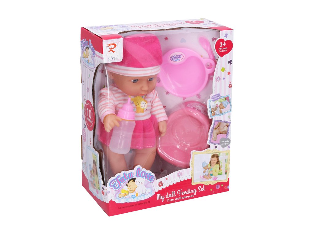 Bábätko cikajúce. Veľkosť 30cm. Bábätko pije z fľaštičky. Obsahuje bábätko, fľaštičku, nočník, tanierik a lyžičku. Bábätko vydáva 10 rôznych zvukov. 3xAG13 batérie súčasťou.Dodatočné parametre