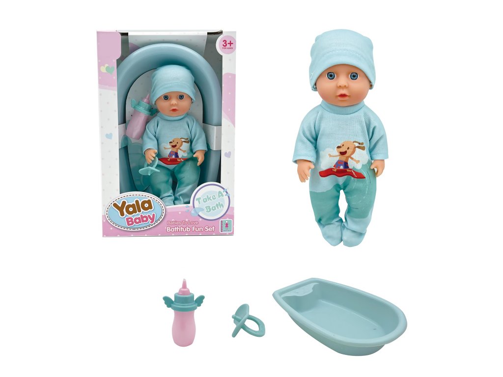 Bábätko s vaničkou modrej. Veľkosť bábätka 9x5x20cm. Veľkosť vaničky 27cm. Obsahuje bábätko, vaničku, fľaštičku na pitie a cumlík.Dodatočné parametre