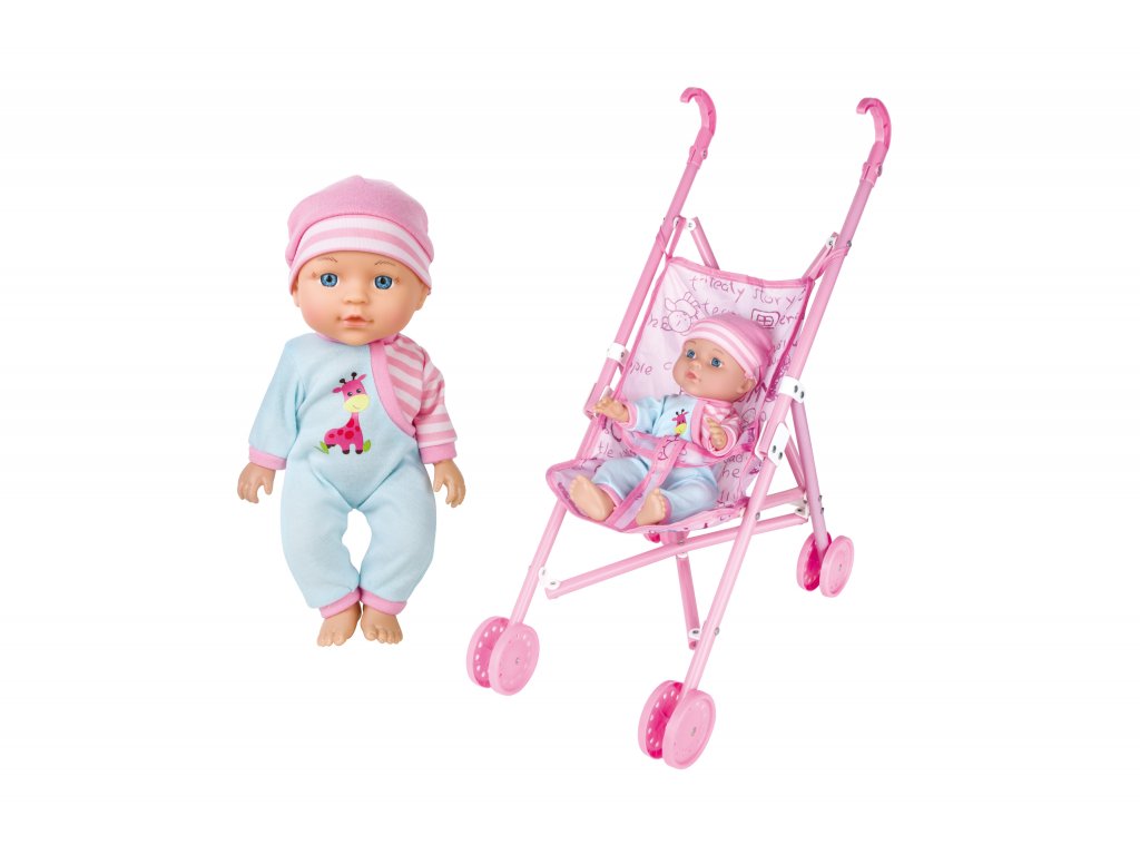 Bábätko so zvukmi a kočíkom. Veľkosť 27 cm. Balenie obsahuje bábätko, zložený kočík, mištičku s príborom, nočník, fľaštičku. Po stlačení bruška zvukové efekty. 3xAG13 batérie súčasťou.Dodatočné parametre