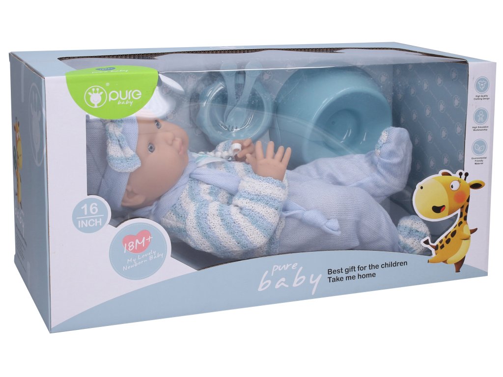 Bábätko v overale modrej. Veľkosť 40 cm. Obsahuje: bábätko, nočník, miska, príbor, cumlík.Dodatočné parametre