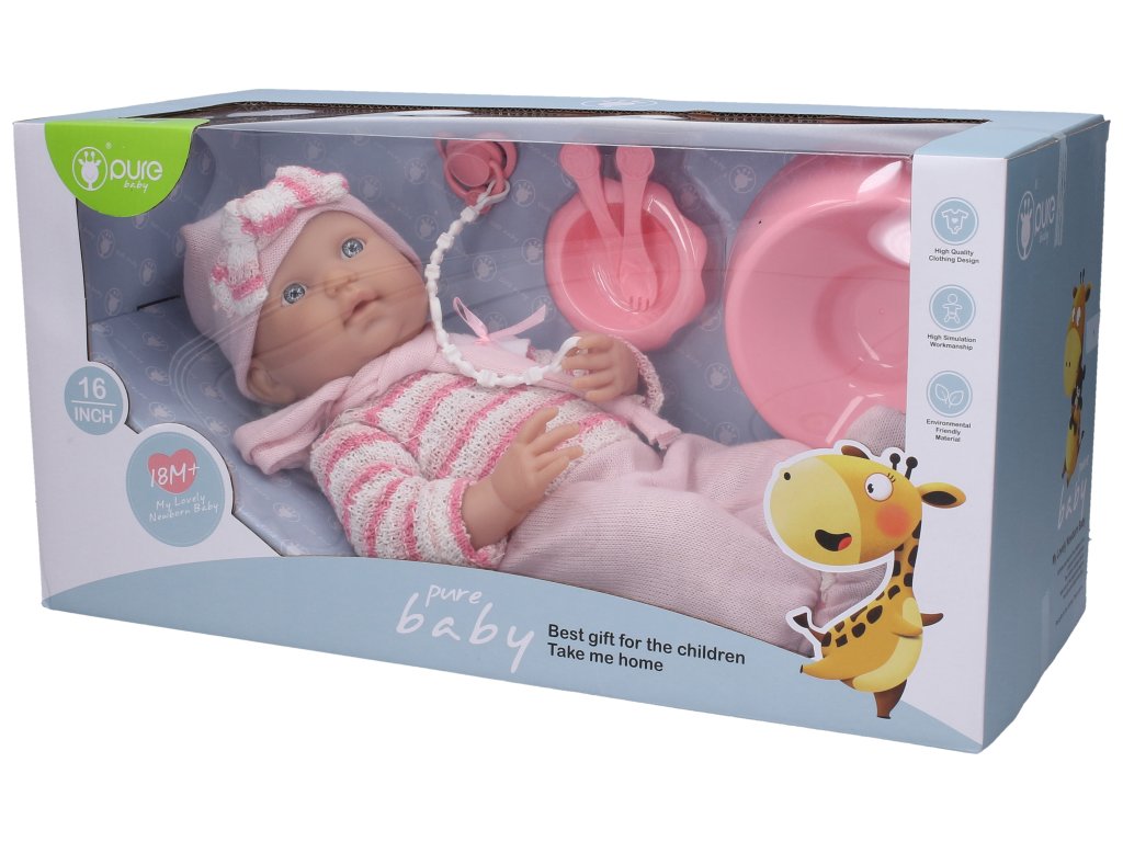 Bábätko v overale ružovej. Veľkosť 40 cm. Obsahuje: bábätko, nočník, miska, príbor, cumlík.Dodatočné parametre