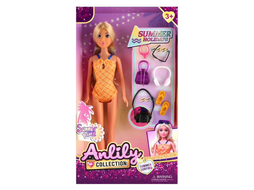 Bábika v plavkách s doplnkami. Veľkosť 30 cm. Doplnky - foťák, kabelka, slúchadlá, okuliare, náhrdelník, žabky.Dodatočné parametre