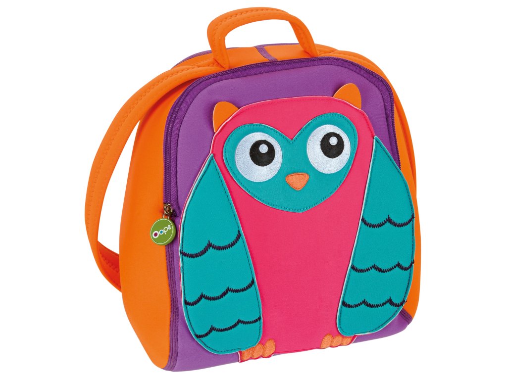 Menší, farebný plecniak, prevažne z polyesteru, motív Sova, s rukoväťou a nastaviteľnými popruhmi z polypropylénu, veľkosť cca 16x30x25 cm. Pre deti staršie ako 18 mesiacov. Pozor: dĺžka popruhu by mala byť nastavená dospelými.Dodatočné parametre