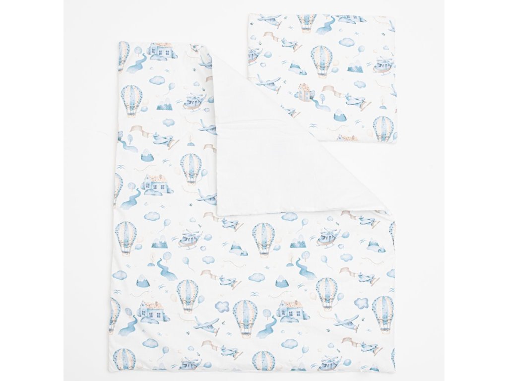Nádherný bavlnený set do kočíka New Baby Romance. Set obsahuje vankúšik a perinku s potlačou rozprávkového dobrodružstva v oblakoch. Všetko je vyplnené antialergickým vláknom. Set je ušitý z vysoko kvalitnej bavlny. Bavlnený set luxusne a jemne pohladí a zahreje pokožku vášho bábätka. Rozmery: vankúš: cca 32x25 cm, perinka: cca 82x68 cm. Zloženie: povlak 100% bavlna, výplň 100% polyester.Tieto výrobky sú bezpečné, pretože: