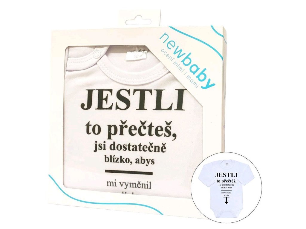 Originálne bavlnené dojčenské body s dlhým rukávom New Baby, s vtipným nápisom JESTLI to prečítaš, si dostatočne blízko, aby si mi vymenil plienku. Farby použité na potlač sú certifikované a vhodné pre bábätká. Je vyrobené z príjemného a kvalitného materiálu, v ktorom sa bude Vaše bábätko cítiť príjemne. Body má zapínanie na cvočky na ramienku a medzi nožičkami, čo uľahčuje obliekanie a prebaľovanie. Doprajte Vášmu bábätku vyniknúť v originálnom bode. Zloženie: 100% bavlna. Rozmery: obvod okolo hrudníka cca 50 cm, dĺžka rukáva cca 26 cm, celková dĺžka cca 42 cm.Produkt českej značky