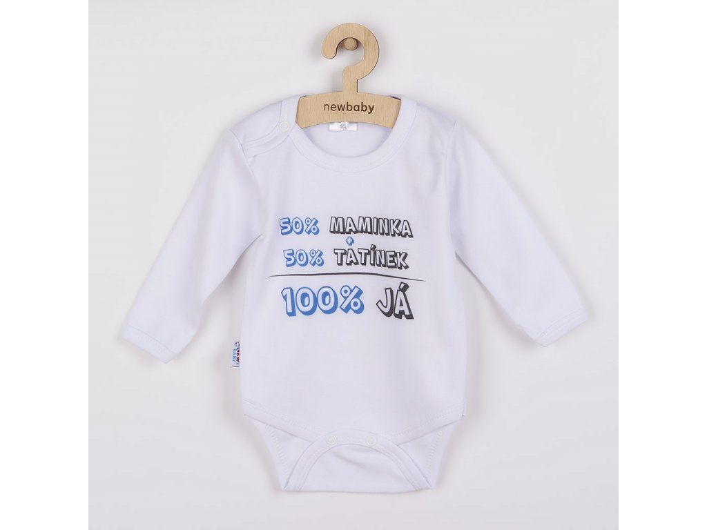 Originálne bavlnené dojčenské body s dlhým rukávom New Baby, s vtipným nápisom 50% MAMIČKA + 50% Otecko - 100% JA. Farby použité na potlač sú certifikované a vhodné pre bábätká. Je vyrobené z príjemného a kvalitného materiálu, v ktorom sa bude Vaše bábätko cítiť príjemne. Body má zapínanie na cvočky na ramienku a medzi nožičkami, čo uľahčuje obliekanie a prebaľovanie. Doprajte Vášmu bábätku vyniknúť v originálnom bode. Zloženie: 100% bavlna. Rozmery: obvod okolo hrudníka cca 50 cm, dĺžka rukáva cca 26 cm, celková dĺžka cca 42 cm.- Produkt českej značky