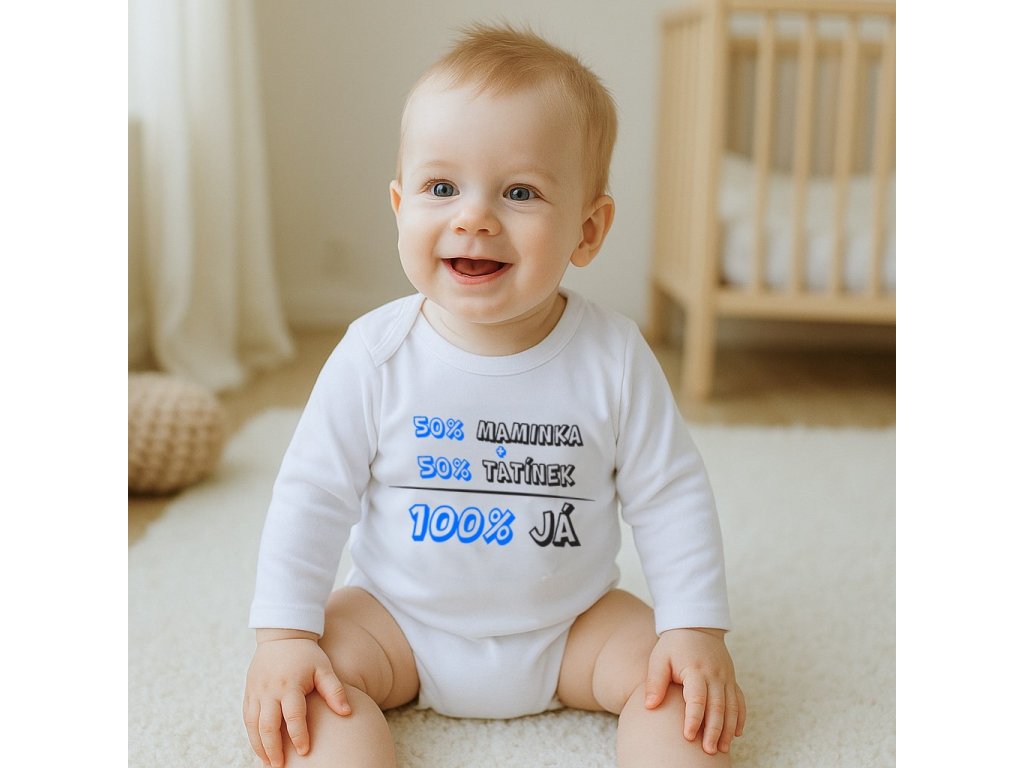 Originálne bavlnené dojčenské body s dlhým rukávom New Baby, s vtipným nápisom 50% MAMIČKA + 50% Otecko - 100% JA. Body má okolo krčku, nožičiek a ručičiek farebné lemovanie. Farby použité na potlač sú certifikované a vhodné pre bábätká. Je vyrobené z príjemného a kvalitného materiálu, v ktorom sa bude Vaše bábätko cítiť príjemne. Body má zapínanie na cvočky na ramienku a medzi nožičkami, čo uľahčuje obliekanie a prebaľovanie. Doprajte Vášmu bábätku vyniknúť v originálnom bode. Zloženie: 100% bavlna. Rozmery: obvod okolo hrudníka cca 40 cm, dĺžka rukáva cca 22 cm, celková dĺžka cca 36 cm.- Produkt českej značky