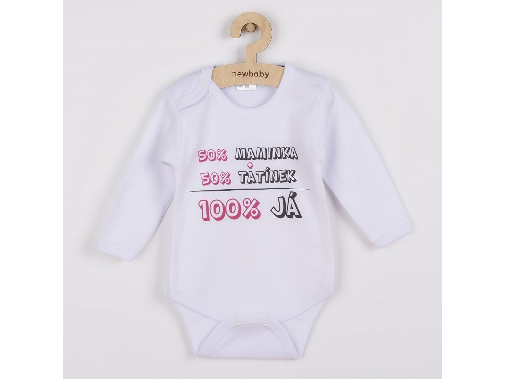 Originálne bavlnené dojčenské body s dlhým rukávom New Baby, s vtipným nápisom 50% MAMIČKA + 50% Otecko - 100% JA. Body má okolo krčku, nožičiek a ručičiek farebné lemovanie. Farby použité na potlač sú certifikované a vhodné pre bábätká. Je vyrobené z príjemného a kvalitného materiálu, v ktorom sa bude Vaše bábätko cítiť príjemne. Body má zapínanie na cvočky na ramienku a medzi nožičkami, čo uľahčuje obliekanie a prebaľovanie. Doprajte Vášmu bábätku vyniknúť v originálnom bode. Zloženie: 100% bavlna. Rozmery: obvod okolo hrudníka cca 50 cm, dĺžka rukáva cca 26 cm, celková dĺžka cca 42 cm.- Produkt českej značky