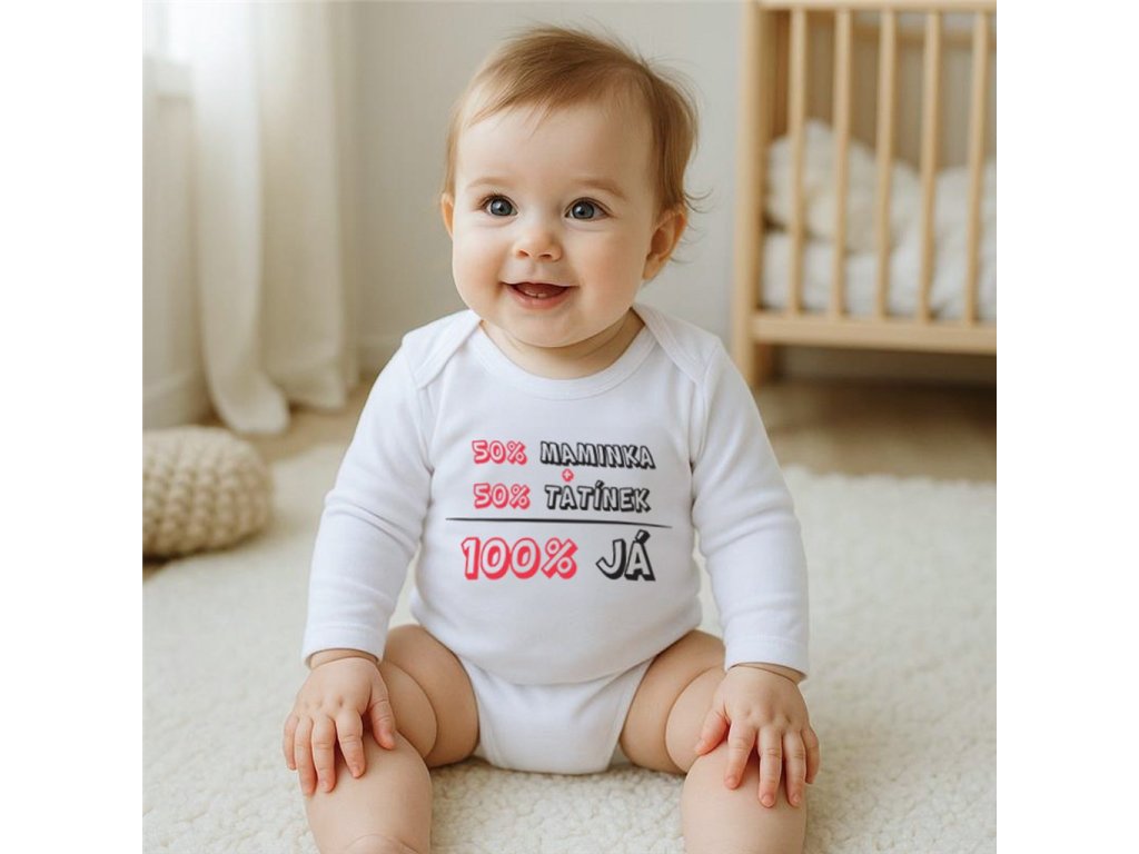 Originálne bavlnené dojčenské body s dlhým rukávom New Baby, s vtipným nápisom 50% MAMIČKA + 50% Otecko - 100% JA. Body má okolo krčku, nožičiek a ručičiek farebné lemovanie. Farby použité na potlač sú certifikované a vhodné pre bábätká. Je vyrobené z príjemného a kvalitného materiálu, v ktorom sa bude Vaše bábätko cítiť príjemne. Body má zapínanie na cvočky na ramienku a medzi nožičkami, čo uľahčuje obliekanie a prebaľovanie. Doprajte Vášmu bábätku vyniknúť v originálnom bode. Zloženie: 100% bavlna. Rozmery: obvod okolo hrudníka cca 36 cm, dĺžka rukáva cca 18 cm, celková dĺžka cca 32 cm.- Produkt českej značky