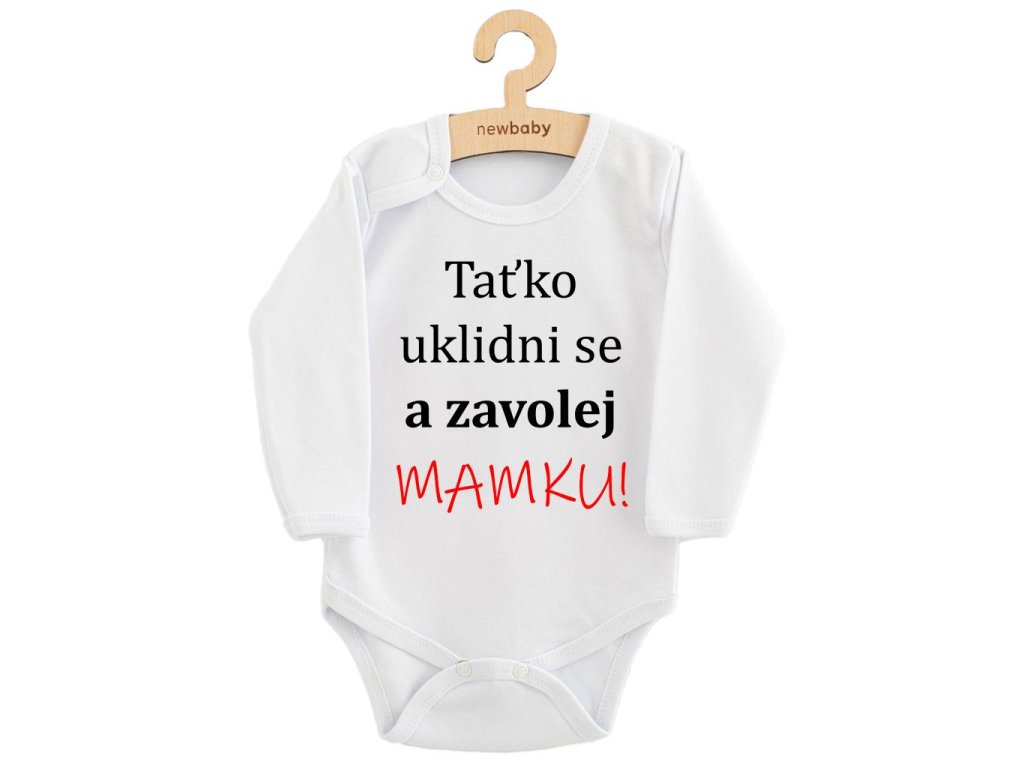 Originálne bavlnené dojčenské body s dlhým rukávom New Baby, s vtipným nápisom Taťko upokoj sa a zavolaj MAMKU! Farby použité na potlač sú certifikované a vhodné pre bábätká. Je vyrobené z príjemného a kvalitného materiálu, v ktorom sa bude Vaše bábätko cítiť príjemne. Body má zapínanie na cvočky na ramienku a medzi nožičkami, čo uľahčuje obliekanie a prebaľovanie. Doprajte Vášmu bábätku vyniknúť v originálnom bode. Zloženie: 100% bavlna. Rozmery: obvod okolo hrudníka cca 36 cm, dĺžka rukáva cca 18 cm, celková dĺžka cca 32 cm.Produkt českej značky