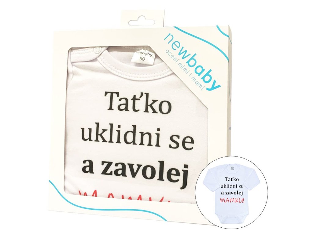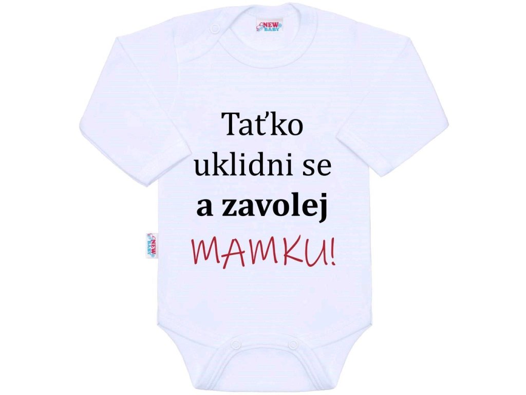Originálne bavlnené dojčenské body s dlhým rukávom New Baby, s vtipným nápisom Taťko upokoj sa a zavolaj MAMKU! Farby použité na potlač sú certifikované a vhodné pre bábätká. Je vyrobené z príjemného a kvalitného materiálu, v ktorom sa bude Vaše bábätko cítiť príjemne. Body má zapínanie na cvočky na ramienku a medzi nožičkami, čo uľahčuje obliekanie a prebaľovanie. Doprajte Vášmu bábätku vyniknúť v originálnom bode. Zloženie: 100% bavlna. Rozmery: obvod okolo hrudníka cca 34 cm, dĺžka rukáva cca 16 cm, celková dĺžka cca 30 cm.
