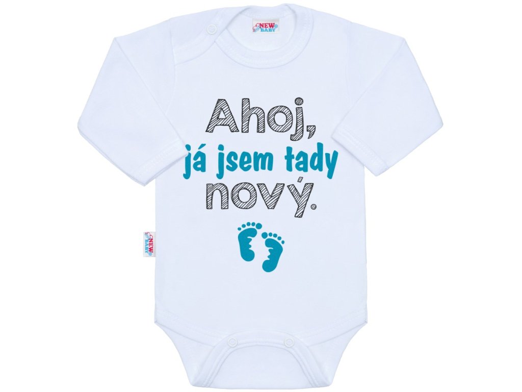 Originálne bavlnené dojčenské body s dlhým rukávom New Baby, s vtipným nápisom Ahoj, ja som tu nový. Farby použité na potlač sú certifikované a vhodné pre bábätká. Je vyrobené z príjemného a kvalitného materiálu, v ktorom sa bude Vaše bábätko cítiť príjemne. Body má zapínanie na cvočky na ramienku a medzi nožičkami, čo uľahčuje obliekanie a prebaľovanie. Doprajte Vášmu bábätku vyniknúť v originálnom bode. Zloženie: 100% bavlna. Rozmery: obvod okolo hrudníka cca 36 cm, dĺžka rukáva cca 18 cm, celková dĺžka cca 32 cm.- Produkt českej značky