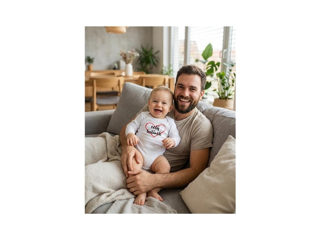 Originálne bavlnené dojčenské body s dlhým rukávom New Baby, s vtipným nápisom celý otecko. Farby použité na potlač sú certifikované a vhodné pre bábätká. Je vyrobené z príjemného a kvalitného materiálu, v ktorom sa bude Vaše bábätko cítiť príjemne. Body má zapínanie na cvočky na ramienku a medzi nožičkami, čo uľahčuje obliekanie a prebaľovanie. Doprajte Vášmu bábätku vyniknúť v originálnom bode. Zloženie: 100% bavlna. Rozmery: obvod okolo hrudníka cca 50 cm, dĺžka rukáva cca 26 cm, celková dĺžka cca 42 cm.Produkt českej značky