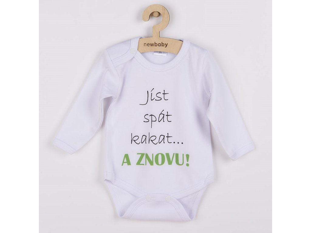 Originálne bavlnené dojčenské body s dlhým rukávom New Baby, s vtipným nápisom jesť spať kakať... A ZNOVA! Farby použité na potlač sú certifikované a vhodné pre bábätká. Je vyrobené z príjemného a kvalitného materiálu, v ktorom sa bude Vaše bábätko cítiť príjemne. Body má zapínanie na cvočky na ramienku a medzi nožičkami, čo uľahčuje obliekanie a prebaľovanie. Doprajte Vášmu bábätku vyniknúť v originálnom bode. Zloženie: 100% bavlna. Rozmery: obvod okolo hrudníka cca 42 cm, dĺžka rukáva cca 23 cm, celková dĺžka cca 38 cm.Produkt českej značky