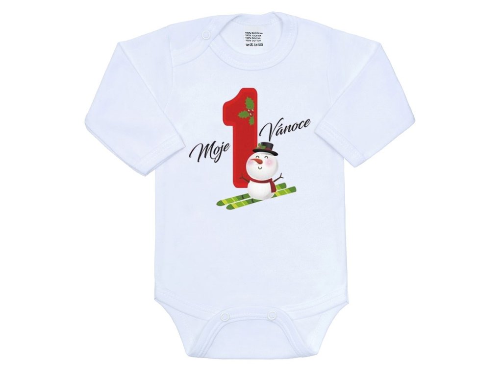 Originálne bavlnené dojčenské body s dlhým rukávom New Baby, s vtipným nápisom Moje prvé Vianoce a obrázkom roztomilého snehuliaka. Farby použité na potlač sú certifikované a vhodné pre bábätká. Je vyrobené z príjemného a kvalitného materiálu, v ktorom sa bude Vaše bábätko cítiť príjemne. Body má zapínanie na cvočky na ramienku a medzi nožičkami, čo uľahčuje obliekanie a prebaľovanie. Doprajte Vášmu bábätku vyniknúť v originálnom bode. Zloženie: 100% bavlna. Rozmery: obvod okolo hrudníka cca 46 cm, dĺžka rukáva cca 24 cm, celková dĺžka cca 40 cm.Produkt českej značky