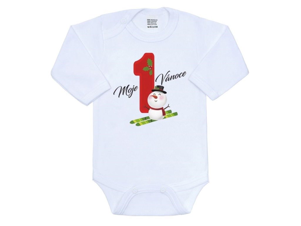 Originálne bavlnené dojčenské body s dlhým rukávom New Baby, s vtipným nápisom Moje prvé Vianoce a obrázkom roztomilého snehuliaka. Farby použité na potlač sú certifikované a vhodné pre bábätká. Je vyrobené z príjemného a kvalitného materiálu, v ktorom sa bude Vaše bábätko cítiť príjemne. Body má zapínanie na cvočky na ramienku a medzi nožičkami, čo uľahčuje obliekanie a prebaľovanie. Doprajte Vášmu bábätku vyniknúť v originálnom bode. Zloženie: 100% bavlna. Rozmery: obvod okolo hrudníka cca 38 cm, dĺžka rukáva cca 21 cm, celková dĺžka cca 33 cm.Produkt českej značky
