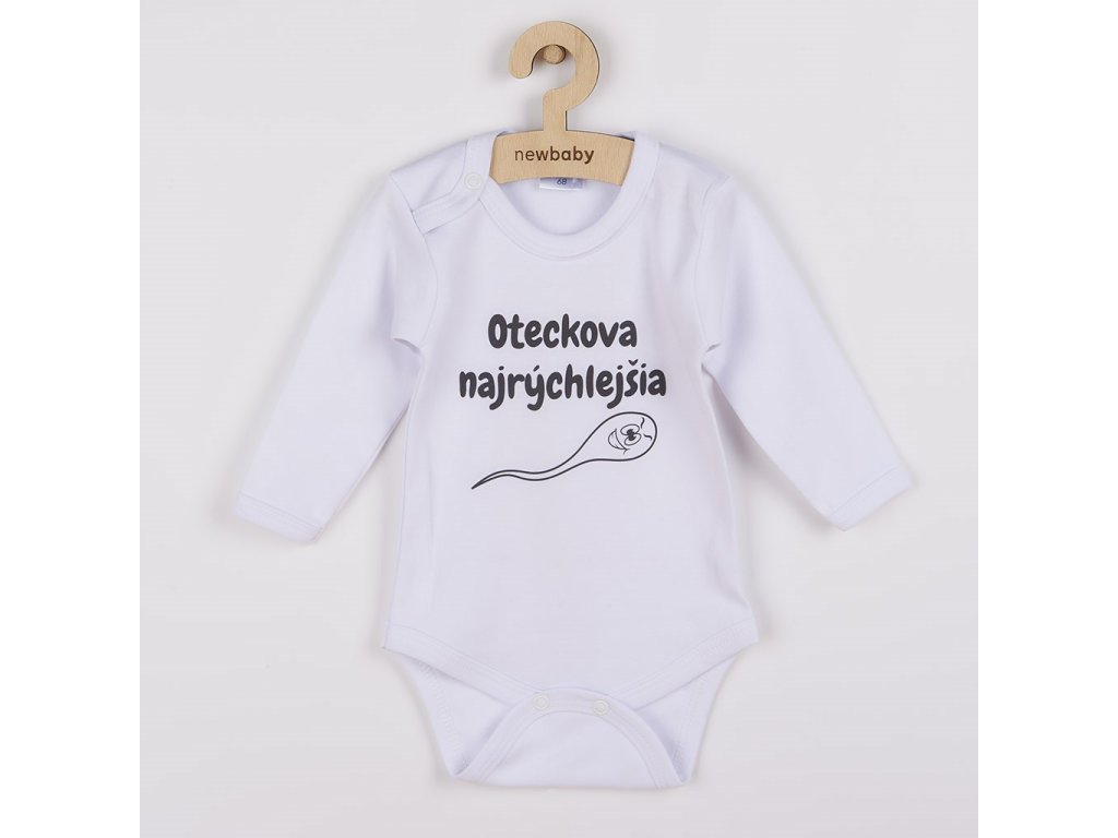 Originálne bavlnené dojčenské body s dlhým rukávom New Baby, s vtipným nápisom OTECKOVA NAJRÝCHLEJŠIA. Farby použité na potlač sú certifikované a vhodné pre bábätká. Je vyrobené z príjemného a kvalitného materiálu, v ktorom sa bude Vaše bábätko cítiť príjemne. Body má zapínanie na cvočky na ramienku a medzi nožičkami, čo uľahčuje obliekanie a prebaľovanie. Doprajte Vášmu bábätku vyniknúť v originálnom bode. Zloženie: 100% bavlna. Rozmery: obvod okolo hrudníka cca 50 cm, dĺžka rukáva cca 26 cm, celková dĺžka cca 42 cm.Produkt českej značky