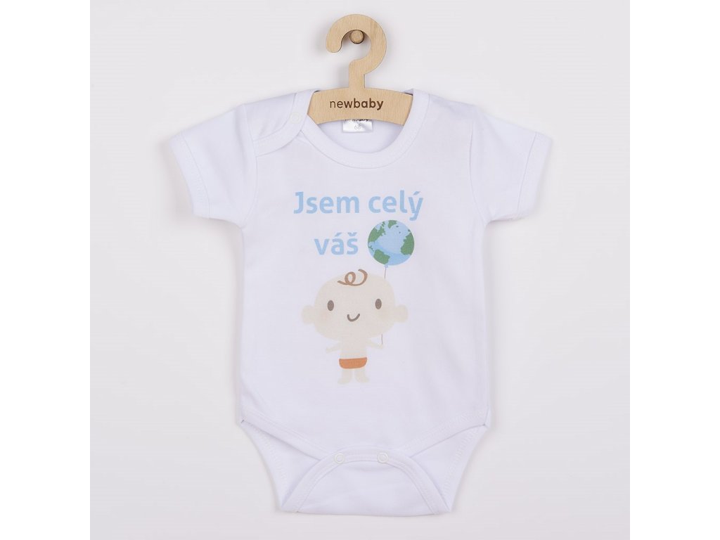 Originálne bavlnené dojčenské body s krátkym rukávom New Baby s nápisom Som celý váš a obrázkom. Farby použité na potlač sú certifikované a vhodné pre bábätká. Je vyrobené z príjemného a kvalitného materiálu, v ktorom sa bude Vaše bábätko cítiť príjemne. Body má zapínanie na cvočky na ramienku a medzi nožičkami, čo uľahčuje obliekanie a prebaľovanie. Doprajte Vášmu bábätku vyniknúť v originálnom bode. Zloženie: 100% bavlna.- Produkt českej značky