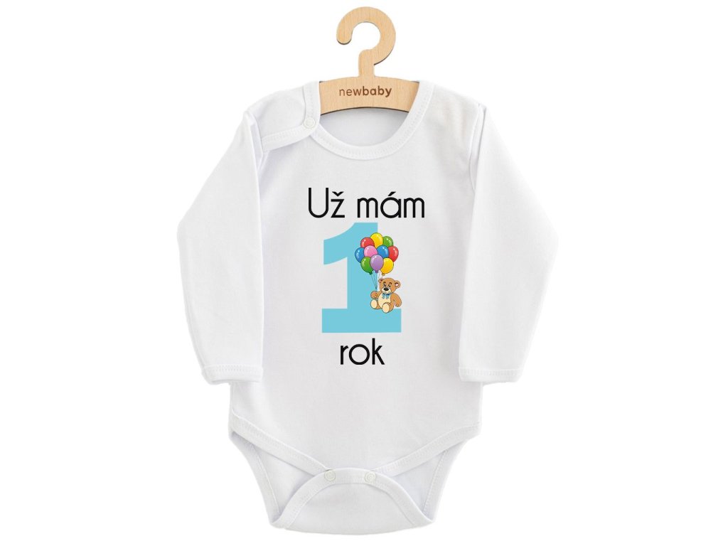 Originálne bavlnené dojčenské body s dlhým rukávom New Baby, s vtipným nápisom Už mám 1 rok a obrázkom veľké jednotky s balónikmi. Farby použité na potlač sú certifikované a vhodné pre bábätká. Je vyrobené z príjemného a kvalitného materiálu, v ktorom sa bude Vaše bábätko cítiť príjemne. Body má zapínanie na cvočky na ramienku a medzi nožičkami, čo uľahčuje obliekanie a prebaľovanie. Doprajte Vášmu bábätku vyniknúť v originálnom bode. Zloženie: 100% bavlna. Rozmery: obvod okolo hrudníka cca 46 cm, dĺžka rukáva cca 24 cm, celková dĺžka cca 40 cm.Produkt českej značky