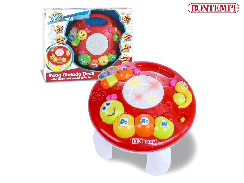 Hudobný stôl pre predškolákov, ktorý obsahuje 7 prednastavených melódií, 3 noty a 2 zvuky bicích. Po stlačení príslušného tlačidla na stole sa aktivuje smiech dieťaťa. Môžete upraviť hlasitosť. Odporúčaný vek: od 12 mesiacov Hračka je napájaná 3 batériami AA, ktoré nie sú súčasťou sady.Dodatočné parametre