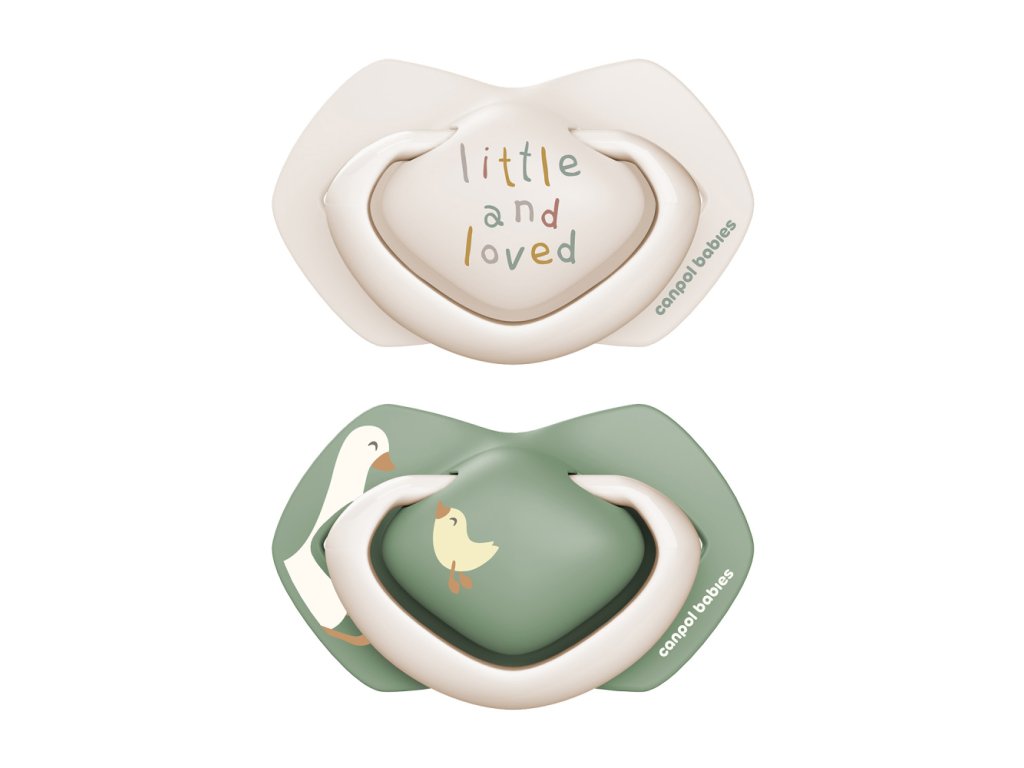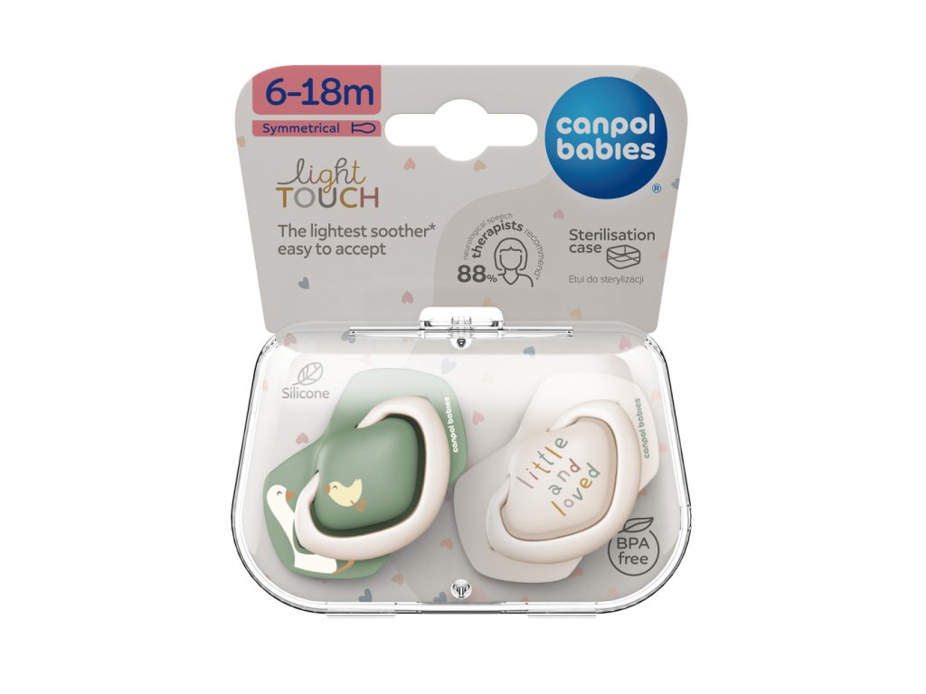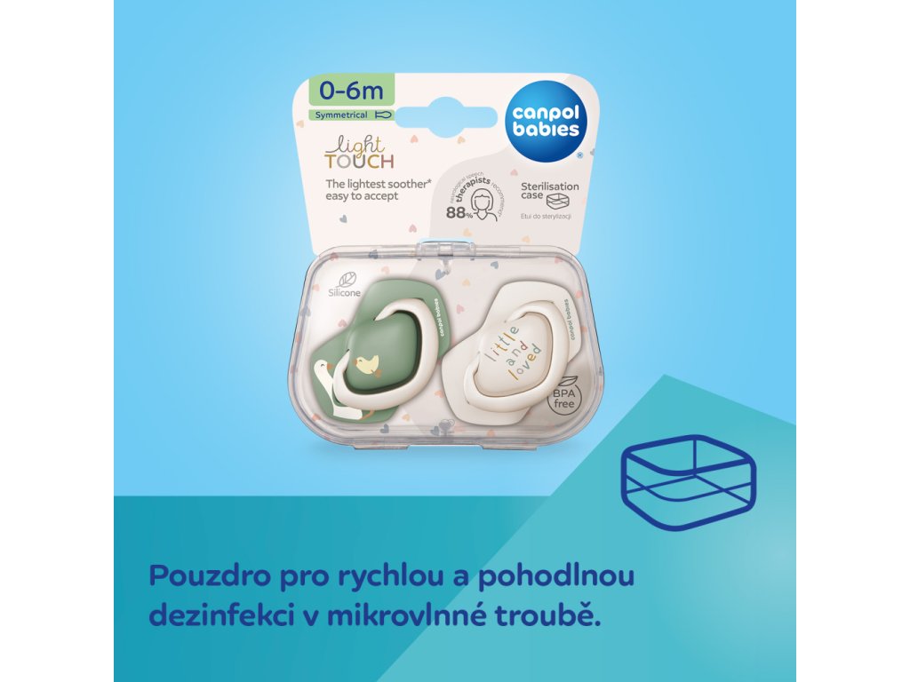 Cumlíky radu Light touch sú odporúčané ako prvý cumlík pre Vaše bábätko. * Sú výnimočne ľahké a prispôsobené tak, aby netlačili na skus dieťaťa, čo má podľa názoru 93% neurologopedov značný význam pre správny vývoj ústnej dutiny. Tento tvar cumlíkov je z fyziologického pohľadu považovaný za najvhodnejší. Výnimočne mäkká špička vyžaduje menšiu námahu pri saní, čo bábätku uľahčuje prijatie cumlíka. Špička je vyrobená zo 100% hypoalergénneho a bezpečného silikónu, je bez chuti a zápachu. Špeciálne tvarovaný štítok umožňuje dieťaťu voľne dýchať nosom a minimalizuje tak odtlačok cumlíka na jemnú tvár bábätka. Postranné otvory na štítku umožňujú detskej pokožke dýchať a zabraňujú tak jej podráždeniu. Pohodlný úchyt cumlíka uľahčuje jeho podávanie vášmu bábätku a umožňuje pripevniť k retiazke alebo stužke, ktorá ochráni cumlík pred stratou, pádom na zem alebo ušpinením. Ľanovej rúre. Na zaistenie hygienickej čistoty cumlíkov stačí trocha vody a 2 minúty. Canpol babies Light touch cumlíky sú veľmi odolné voči deformácii. Pri ich výrobe neboli použité BPA ani iné škodlivé látky. Symetrický silikónové cumlíky Canpol babies Light touch sa odporúčajú pre deti vo veku 0-6 mesiacov. Cumlík je dostupný v dvoch farbách a rôznych veľkostiach - rastie spoločne s vašim bábätkom. *Na základe prieskumu vykonaného spoločnosťou Canpol Sp. z oo v skupine 25 neurologopedov v roku 2020. Extrémne ľahký cumlík je odporúčaný 88% neurologopedov * ako prvý cumlík pre vaše bábätko. Podľa názoru 93% neurologopedov * ľahký štítok netlačí na skus bábätka a má významný vplyv pre správny vývoj. z oo v skupine 25 neurologopedov v roku 2020."Cudlík Light touch spĺňa všetky neurologopedické kritériá pre výber cumlíka v prvých mesiacoch života bábätka."Marcelina Przeździw - neurologopedická terapeutka, vysokoškolská lektorka. Výnimočne ľahká a mäkká silikónová špička vyžaduje menej námahy pri saní a uľahčuje bábätku prijatie cumlíka. Špička je vyrobená zo 100% hypoalergénneho a bezpečného silikónu, bez chuti a zápachu. Silikónová špička je odolná proti deformácii. Tvarovaný štítok cumlíka pod nosom umožňuje bábätku voľne dýchať. Dezinfekčné puzdro na rýchlu a pohodlnú dezinfekciu cumlíkov v mikrovlnnej rúre. Navrhnuté európskymi dizajnérmi a vyrobené v EÚ. Pokyny pre dezinfekciu v puzdre:1. Pred prvým a každým ďalším použitím umyte dezinfekčné puzdro v teplej vode s jemným saponátom, dôkladne opláchnite.2. Do spodnej časti puzdra nalejte 25 ml prevarenej vody. DÔLEŽITÉ upozornenie, ak pridáte malé množstvo vody môžete puzdro znehodnotiť. Pokiaľ pridáte naopak viac ako 25ml vody nebude dezinfekcia cumlíkov vykonaná správne.3. Vložte cumlíky do puzdra.4. Nasaďte hornú časť veka a pevne puzdro zatvorte.5. Uzavreté puzdro vložte do mikrovlnnej rúry.6. Mikrovlnú rúru nastavte na 750-1000W - doba dezinfekcie sú 2 minúty. Neprekračujte dobu dezinfekcie.UPOZORNENIE!Dezinfekčné puzdro by malo byť počas dezinfekcie umiestnené na rovnom povrchu. Pred vybratím z mikrovlnnej rúry vždy počkajte aspoň 5 minút, kým puzdro vychladne. Pri vybratí a otváraní puzdra buďte opatrní. Vylejte zostávajúcu vodu z puzdra cez určený otvor, opláchnite a osušte. Pri vybratí dezinfikovaných cumlíkov buďte zvlášť opatrní, pretože môžu byť horúce. Počas dezinfekcie sa môže do cumlíka dostať voda. Pred použitím cumlíka vodu odstráňte. Pred ďalšou dezinfekciou počkajte 15 minút, aby puzdro úplne vychladlo. Ako používať: Pred prvým použitím prípravok vložte na 5 minút do vriacej vody. Potom po vychladnutí vytlačte zvyšnú vodu. To je nevyhnutné na zabezpečenie hygieny. Pred každým použitím cumlík umyte teplou vodou. Potom prelejte vriacou vodou. Cumlík je možné dezinfikovať v parných/elektrických sterilizátoroch alebo v priloženom puzdre podľa dodaného návodu. Na čistenie nepoužívajte antibakteriálne alebo abrazívne čistiace prostriedky. Príliš vysoké koncentrácie čistiacich prostriedkov môžu poškodiť plastové diely. Neumývajte cumlík v umývačke riadu. Neponárajte cumlík do žiadnej sladkej tekutiny alebo liekov, pretože to môže spôsobiť zubný kaz. Aby ste zaistili pohodlie a bezpečie vášho bábätka, vymieňajte cumlík každé 1-2 mesiace. Pokiaľ si dieťa vloží celý cumlík do úst, NEPREDPAĎAJTE panike. Cumlík je navrhnutý tak, aby ho dieťa nemohlo prehltnúť. Akonáhle si všimnete, že vaše dieťa vložilo do úst celý cumlík, vyberte ho čo najšetrnejšie. Uchovávajte cumlík v čistom, suchom a uzavretom puzdre. VAROVANIE! Pred každým použitím výrobok starostlivo skontrolujte. Zatiahnite za cumlík všetkými smermi. Pokiaľ javia akékoľvek známky poškodenia, výrobok zlikvidujte. Nenechávajte cumlík na priamom slnku, v blízkosti zdrojov tepla alebo v dezinfekčnom prostriedku („sterilizačnom“ roztoku) dlhšie, než je odporúčané, mohlo by dôjsť k poškodeniu silikónovej špičky. Odporúčame odstaviť dieťa od cumlíka ideálne do 3 rokov veku dieťaťa. Pre bezpečie vášho dieťaťaVAROVANIE! Pred každým použitím výrobok dôkladne skontrolujte. Ťahajte za silikónovú časť cumlíka vo všetkých smeroch. Pri prvých známkach poškodenia alebo opotrebovania materiálu ho ihneď vyhoďte. Používajte iba špeciálne stužky/retiazky na cumlíky, ktoré zodpovedajú norme EN 12586. Nikdy nepripevňujte k cumlíku iné stužky alebo šnúrky, vaše dieťa by sa nimi mohlo uškrtiť.