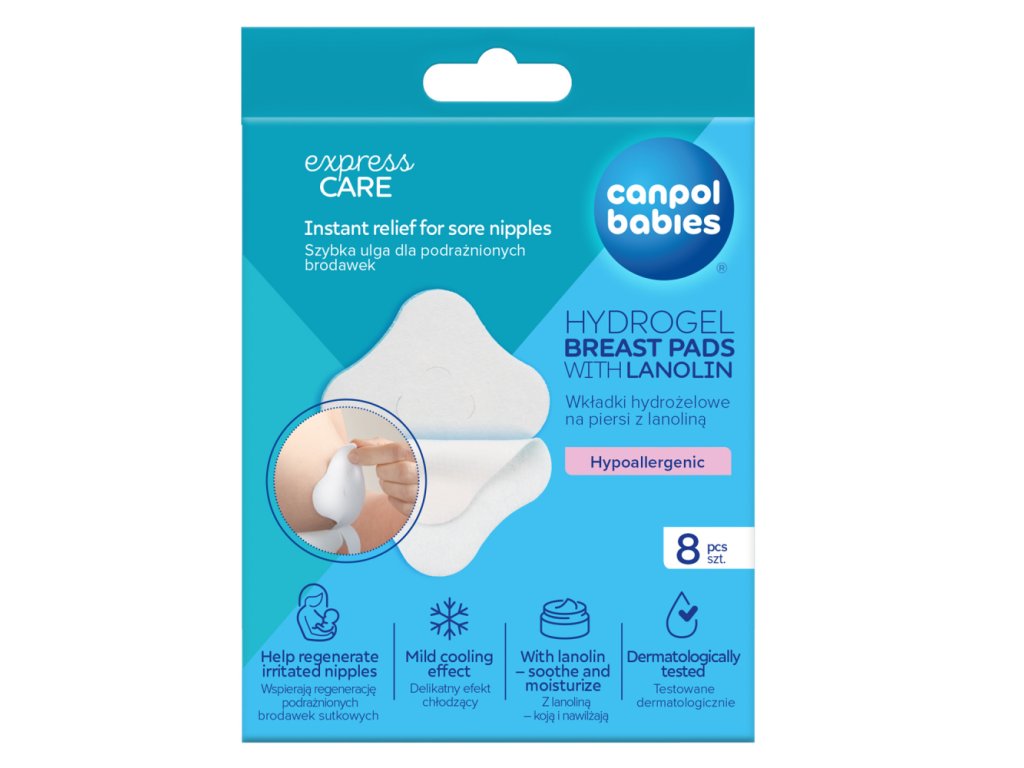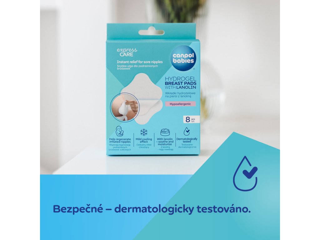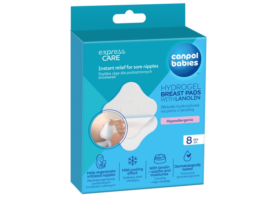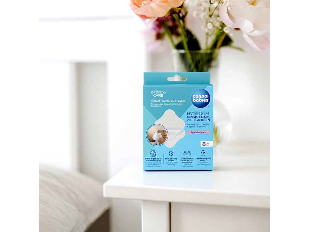 Mäkké hydrogélové prsné vankúšiky Canpol babies s lanolínom ponúkajú upokojujúci účinok na boľavé bradavky. Podporujú regeneráciu pokožky a zároveň obnovujú prirodzenú vlhkosť tak, aby ste mohli pokračovať v dojčení. Slúži aj ako ďalšia ochranná vrstva pre citlivé bradavky, zabraňujú podráždeniu z odevu, najmä pri hojení poranení. S jemným chladivým účinkom prinášajú okamžitý pocit úľavy, upokojujú poškodenú pokožku bradaviek a zaisťujú optimálne podmienky na hojenie a regeneráciu. Vďaka jednoduchému zloženiu sú hydrogélové prsné vankúšiky Canpol babies netoxické a neobsahujú žiadne konzervačné látky. Ideálne na použitie ako obklad medzi jednotlivým dojčením. Ľahko a bez bolesti sa dajú zložiť z kože. Po aplikácii na prsia sa prsné vankúšiky nepohnú, nerolujú sa, nešpinia spodnú bielizeň a nezanechávajú na oblečení žiadne mokré škvrny. Balenie obsahuje 4 vrecká, po 2ks prsných vankúšikov. Pre vašu bezpečnosť ho používajte tak, ako je uvedené v návode alebo na štítku. V prípade pochybností sa poraďte s odborníkom. Okamžitá úľava pre boľavé bradavky - mierny chladiaci efekt. Podpora regenerácie boľavých bradaviek. S lanolínom - účinne upokojuje a hydratuje pokožku. Bezpečné - netoxické a bez konzervačných látok. Dermatologicky testované. Pre bezpečnosť používajte podľa návodu alebo štítku. V prípade pochybností sa poraďte s odborníkom. Doplňujúce informácie: Balenie obsahuje 8ks, balené po 2ks v ochrannej fólii Kód šarže a dátum spotreby sú uvedené na obale. Hydrogélové hojace prsné vankúšiky by mali byť skladované v chladnom, suchom, anti-koróznom priestore s relatívnou vlhkosťou nie viac ako 85% a dobrým vetraním. Ako používať: Pred použitím prsných vankúšikov si umyte ruky. Otvorte obal, vyberte hydrogélový vankúšik z vrecka a odstráňte. Nedotýkajte sa navlhčenej strany prstami.Jemne priložte navlhčenú stranu na pokožku bradaviek. Pred dojčením vyberte vankúšiky a položte na čistý povrch, navlhčenou stranou nahor. Jemne umyte bradavky vlažnou vodou a osušte. Toto je jednorazový produkt. Neodporúčame jeho opakované použitie, pretože by mohlo viesť k množeniu baktérií. Symbol znázorňujúci jednorazové použitie nájdete na obale produktu:Ak sa hydrogélový prsný vankúšik zakalí alebo zašpiní, vyhoďte ho a použite nový. Čistenie môže viesť k strate funkčnosti produktu.Neotvorené vrecko s hydrogélovými prsnými vankúšikmi je možné pre ešte lepšie chladenie umiestniť do chladničky krátko pred použitím.Bezpečnostné a varovné informácie:Používajte iba tak, ako je uvedené. Uchovávajte mimo dosahu detí. Skladujte na chladnom a suchom mieste. Nepoužívajte, ak je obal otvorený alebo poškodený. Pri aplikácii na silne popraskané bradavky sa odporúča byť obzvlášť opatrní. asistentku alebo lekára. Používajte iba podľa priloženého návodu. Uchovávajte mimo dosahu detí. Skladujte na chladnom a suchom mieste. Nepoužívajte, ak je obal otvorený alebo poškodený. Pri aplikácii na silne popraskané bradavky je odporúčaná zvláštna opatrnosť. Hydrogélová vložka nie je určená na liečbu hlbokých rán alebo krvácavých rán. Ak bradavky krvácajú alebo pociťujete pálenie, obráťte sa na odborníka na dojčenie, pôrodnú asistentku alebo lekára. Tento produkt je nerozpustný vo vode, nevyhadzujte ho do toalety. Chráňte pred slnečným žiarením.Dodatočné parametre
