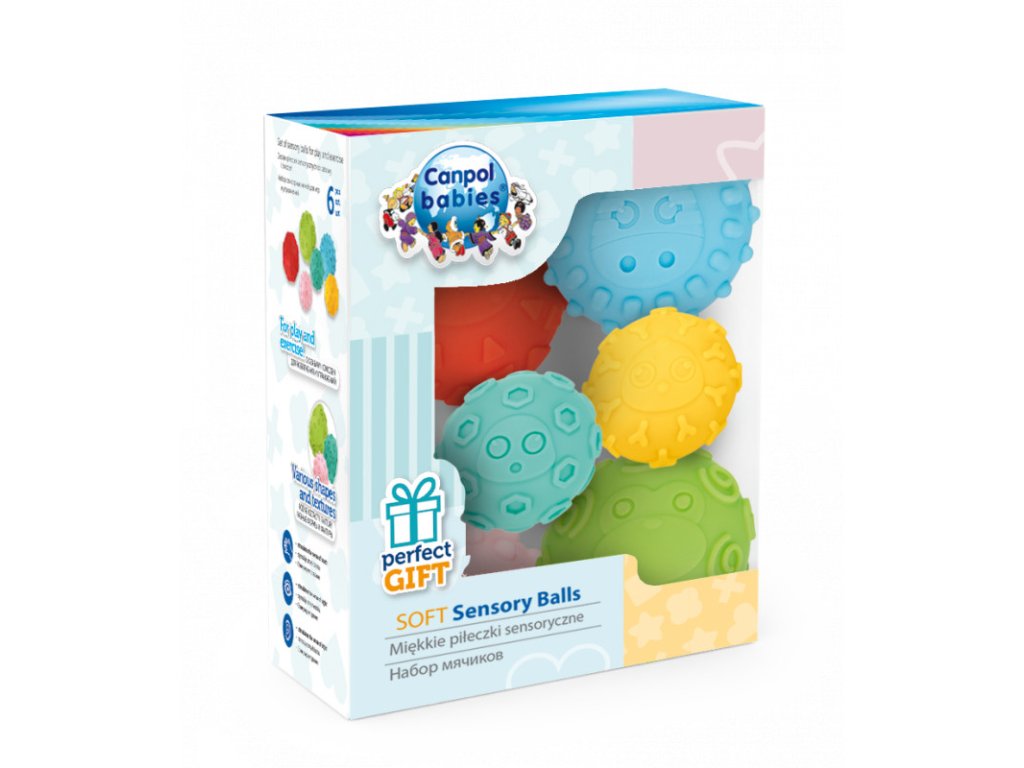 Jemné senzorické loptičky sú určené predovšetkým na zábavu a objavovanie v prvých mesiacoch života bábätiek. Tieto loptičky pomáhajú rodičom podporiť vývoj ich bábätiek vo veľmi rannej fáze. Rozmanité tvary a materiály poskytujú rôznorodé senzorické vnemy. Umožňujú trénovať úchop a stimulovať dotyk. Svieže, veselé farby povzbudia malé stvorenia k aktivite a hre. Loptičky môžu byť taktiež použité pre jemnú masáž. Set obsahuje 6 loptičiek rôznych farieb, ktoré sú zabalené v atraktívnej darčekovej krabici a neobsahujú BPA.