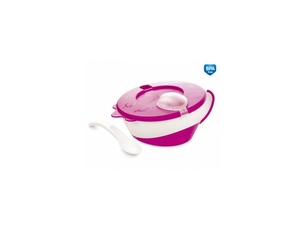 Ľahká, farebná, praktická miska s lyžičkou vo viečku je ideálna jedálenská pomôcka pri každodenných prechádzkach alebo cestovaní. Lyžička je hygienicky uzavretá v priehľadnom viečku. Protišmykové dno zabraňuje kĺzaniu misky po doske stola. Vďaka pogumovanému ergonomickému ušku sa miska dobre drží pri kŕmení. Objem 350 ml. V balení 1 kus.