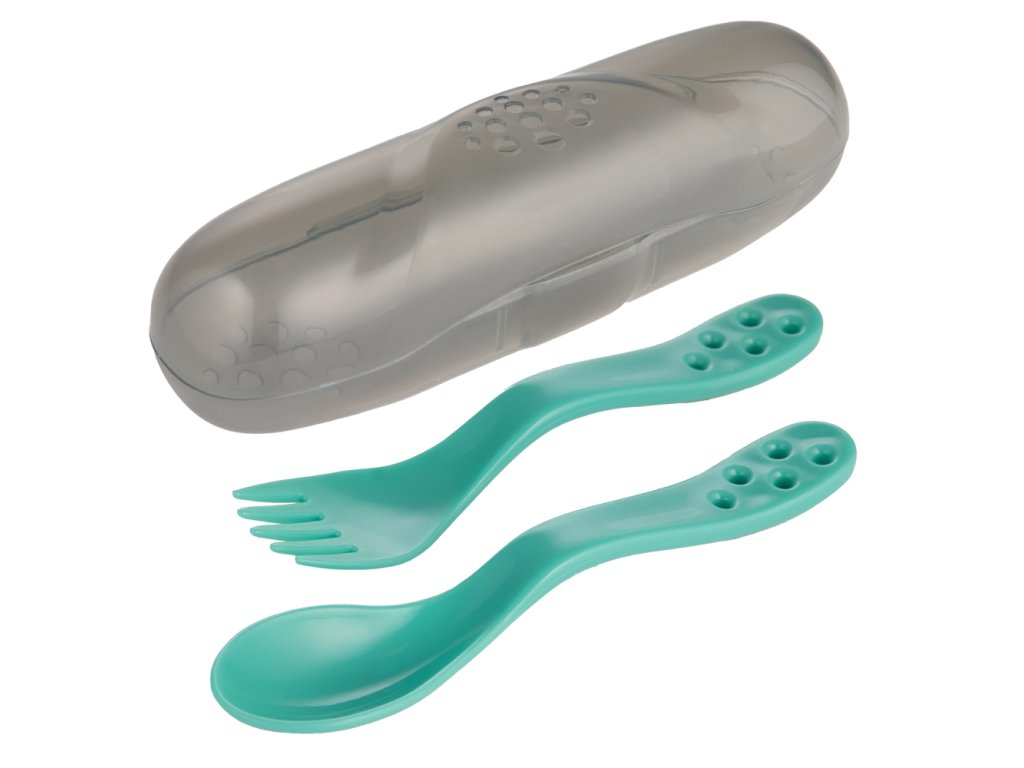 Plastový príbor (vidlička a lyžička) v puzdre je vyrobený z bezpečných materiálov. Zaoblené tvary sú prispôsobené citlivým detským ďasnám. Puzdro chráni príbor pred znečistením.