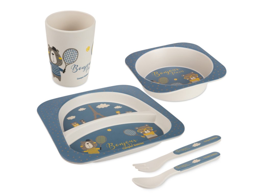 Sada riadu BONJOUR PARIS je ekologickou alternatívou klasických tanierov a misiek z plastu. Sada riadu je vyrobená z pevného, odolného, nerozbitného materiálu vhodného na styk s potravinami, za použitia prírodných surovín – 50 % drevitých vlákien a 30 % kukuričného škrobu (a 20 % melamínovej živice).Sada obsahuje: tanier, misku, hrnček a príbor – vidličku a lyžicu. Príbor má zaoblené hrany, vďaka čomu je bezpečný pre detské ústa a jemné ďasná. Sada detského riadu BONJOUR PARIS s roztomilou potlačou povzbudí vaše dieťa k jedlu. Súprava detského riadu Canpol babies z kolekcie BONJOUR PARIS je ideálna pre deti od 12 mesiacov, ktoré sa učia samy jesť a piť. Možno umývať v umývačke s použitím nefarbených tabliet do umývačky a jemných umývacích prostriedkov. Sada riadu pre bábätká BONJOUR PARIS sa bude skvele hodiť doma, na dovolenke alebo na pikniku.