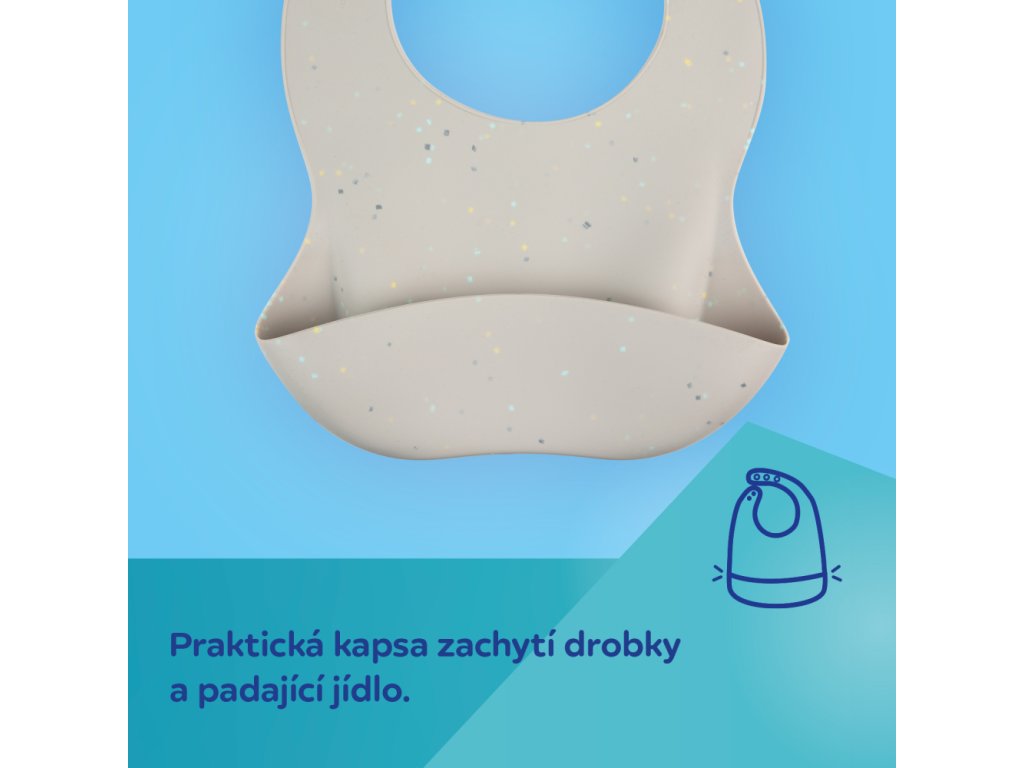 Vodotesný silikónový podbradník s vreckom je nevyhnutný pri rozširovaní jedálnička vášho bábätka a pri prvom samostatnom kŕmení. Dokonale ochráni oblečenie vášho dieťaťa pred ušpinením a mokrom pri jedle. Je ľahký, mäkký, pružný a príjemný na dotyk. Podbradník je vyrobený zo 100% vysoko kvalitného potravinárskeho silikónu, vďaka čomu je bezpečný a bez zápachu. Praktické hlboké vrecko uchová zvyšky jedla, ktoré neskončili v ústach dieťaťa. Vrecko je navrhnuté tak, aby po naplnení jedlom zachovalo svoj tvar a dieťa ho pri pohybe alebo pritlačení náhodou nevysypalo. Podbradník sa ľahko čistí - môžete ho opláchnuť pod tečúcou vodou, utrieť alebo umývať v umývačke riadu.