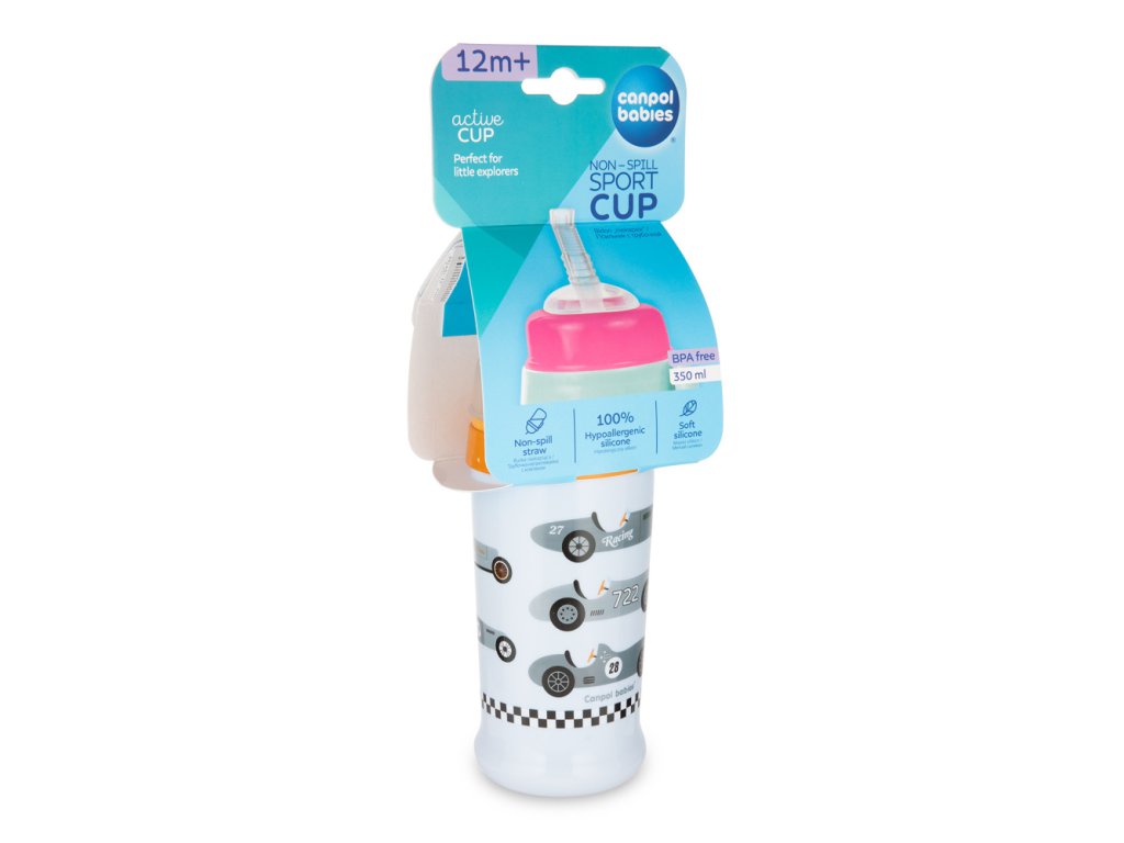 Praktická farebná fľaša so silikónovou nevylievacou slamkou je určená pre deti staršie ako 12 mesiacov, ktoré už vedia samé piť. Ideálne na cestovanie alebo prechádzky. Mäkká silikónová slamka je bezpečná pre citlivé detské ďasná. Membrána v slamke zabraňuje vytekaniu tekutiny pokiaľ je fľaša nesená hore dnom alebo je upustená. Tekutina vyteká iba vtedy, ak dieťa saje zo slamky. Prietok tekutiny závisí od intenzity sania dieťaťom. Silikónová slamka je spojená s plastovou slamkou, ktorá vedie na dno fľaše a uľahčuje vypitie nápoja. Slamka nie je určená deťom mladším ako 6 mesiacov. Fľaša je vyrobená z bezpečného materiálu, ktorý je odolný proti poškodeniu. Viečko chráni náustok pred znečistením. Úchyt umožňuje pripevnenie fľaše ku kočíku alebo opasku. Objem 350 ml. Fľaša neobsahuje BPA.