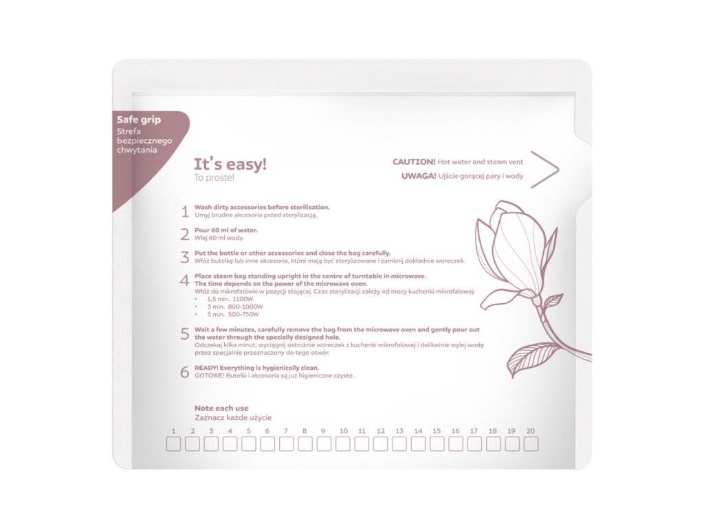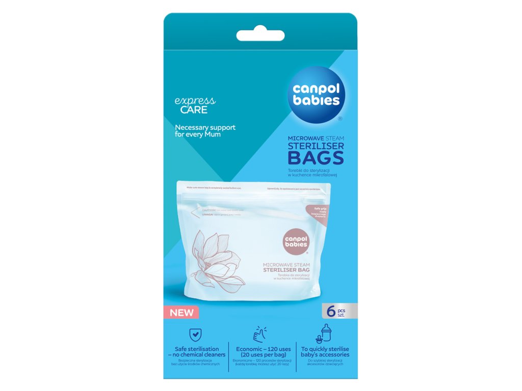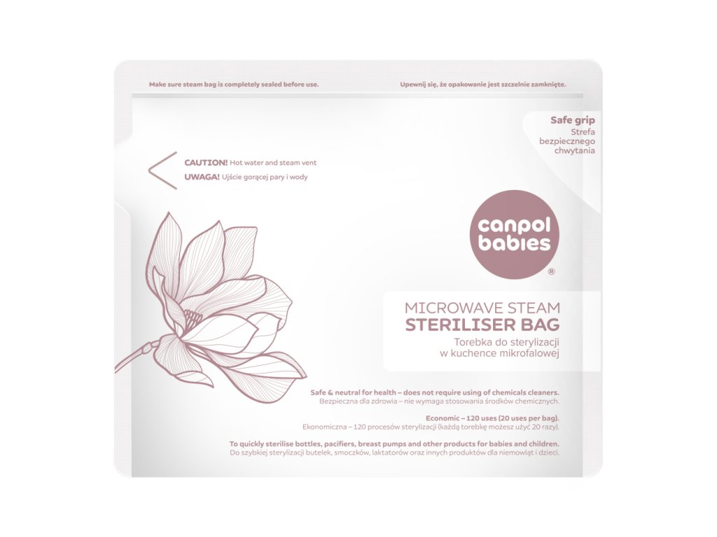 Sterilizačné vrecká do mikrovlnnej rúry Canpol babies predstavujú jednoduchý, rýchly a bezpečný spôsob sterilizácie fliaš, cumlíkov, častí odsávačiek mlieka a ďalších dojčenských a detských produktov. Táto forma sterilizácie je bezpečná, bez chemikálií a trvá iba 90 sekúnd. Vodná para, ktorá sa v sáčku vytvára počas procesu sterilizácie, eliminuje baktérie a choroboplodné zárodky a zaisťuje hygienickú čistotu. Každé vrecko je možné použiť až 20-krát, čo umožňuje celkom 120 sterilizácií v jednom balení. Tento produkt nahrádza tradičný sterilizátor, keď ste mimo domova a nemôžete si prístroj vziať so sebou alebo máte doma nedostatok úložného priestoru. Sú vyrobené z nezávadného plastu, bez BPA a iných škodlivých látok. Pre rýchlu sterilizáciu príslušenstva, cumlíkov, fliaš alebo častí odsávačky materského mlieka. začných sáčkov. Účelom sterilizačných sáčkov je dezinfikovať fľaše, cumlíky, príslušenstvo odsávačky mlieka a ďalšie produkty, ktoré je možné použiť v mikrovlnnej rúre. Nevkladajte vrecko do rúry ani grilu, neklaďte vrecko na mikrovlnný rošt. Ako používať: Príslušenstvo, ktoré chcete dezinfikovať, rozoberte na jednotlivé prvky. Všetky časti umyte teplou vodou a jemným čistiacim prostriedkom. Do vrecka nalejte 60 ml vody. Vložte fľašu alebo iné príslušenstvo, ktoré chcete dezinfikovať, a vrecko starostlivo uzavrite. Pamätajte na to, aby ste nevkladali viac, než sa zmestí do vrecka. Umiestnite vrecko do mikrovlnnej rúry na stojato a vrecko pevne uzavrite. Uistite sa, že vrecko bezpečne stojí a môže sa v mikrovlnnej rúre voľne otáčať. Doba závisí od výkonu mikrovlnnej rúry: 1,5 minúty 1100W 3 minúty 800-1000W 5 minút 500-750W Počkajte niekoľko minút, opatrne vyberte vrecko z mikrovlnnej rúry a opatrne vylejte vodu špeciálnym otvorom. je. Príslušenstvo, ktoré ihneď po dezinfekcii nepoužijete, uchovávajte v čistej nádobe s vekom alebo ich zabaľte do čistého papiera či handričky. Vrecko je možné použiť maximálne 20x. Pre značenie, koľkokrát ste sáčok použili, využite označenie použitia na sáčku a začiarknite políčko. UPOZORNENIE! Pred použitím vrecka v mikrovlnnej rúre sa uistite, že je obal pevne uzavretý. Po sterilizácii vrecko opatrne otvorte, môže unikať horúca para. Zabránite tak možnosti popálenia.