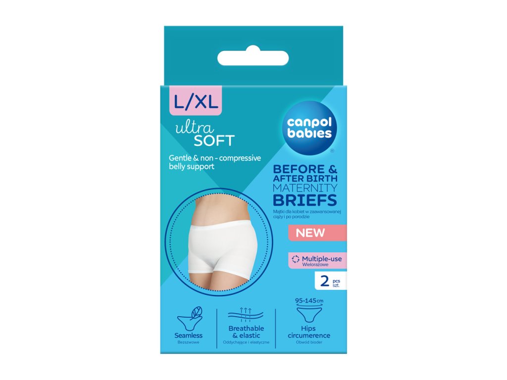 Veľmi pohodlná a bezšvová alternatíva ku klasickým tehotenským nohavičkám. Boli navrhnuté špeciálne pre mamičky a budúce mamičky, ktoré hľadajú pohodlné tehotenské a popôrodné spodné prádlo. Efektívne fixujú bruško bez pocitu trenia alebo nepohodlia. Nedráždia pokožku a zaisťujú voľné prúdenie vzduchu. Diskrétne, pod oblečením neviditeľné, poskytujú pohodlie po celý deň. Tehotenské nohavičky Canpol babies perfektne držia popôrodnú vložku na svojom mieste a zaisťujú pohodlie pri používaní. Vhodná popôrodná bielizeň uľahčuje a urýchľuje hojenie rán, ako po fyziologickom pôrode, tak po cisárskom reze. Vysoký pás nohavičiek je šetrný k jazve po cisárskom reze. Tehotenské a popôrodné nohavičky Canpol babies 2v1 sú opakovane použiteľné a možno ich prať v ruke alebo aj v práčke pri teplote do 60 °C. Balenie obsahuje 2 kusy. Veľkosť L/XL je vhodná pre ženy s obvodom bokov od 95 do cca. 145 cm. Nohavičky majú certifikát kvality Oeko-Tex. Certifikát OEKO-TEX® Standard 100 je zárukou bezpečnosti textilných výrobkov prichádzajúcich do priameho kontaktu s pokožkou, použitý materiál neobsahuje žiadne škodlivé látky, ktoré môžu mať negatívny dopad na ľudské zdravie a životné prostredie, vrátane: pesticídov, chlórfenolov, formaldehyd, alergénne ku klasickým kalvádram. Veľmi pohodlné a bezšvové. Priedušné a veľmi pružné - perfektne sadnú na bruchu. Efektívne fixuje brucho bez pocitu trenia a nepohodlia. Priedušné a mäkké - nedráždi pokožku a umožňujú voľné prúdenie vzduchu. Dokonale udržuje popôrodnú vložku na mieste. Vysoký pás - šetrné k jazve po cisárskom reze. Tehotenské a popôrodné nohavičky majú certifikát kvality Oeko-Tex. Doplňujúce informácie:2 kusy v balení. Tehotenské a popôrodné nohavičky sú dostupné v bielej farbe v dvoch veľkostiach: S/M obvod bokov 80-120cm, L/XL obvod bokov 95-145cm.Ako používať: Tehotenské a popôrodné nohavičky sú vhodné pre viacnásobné použitie. Odporúčame ručné pranie v jemnom tekutom pracom prostriedku alebo v práčke pri teplote 60 °C. Pre zachovanie hygieny by sa nohavičky mali pravidelne prať. Upozornenie! Výrobok nie je hračka. Uchovávajte mimo dosahu dieťaťa. Nohavičky zodpovedajú požiadavkám: Smernica Európskeho parlamentu a Rady 2001/95/EC o všeobecnej bezpečnosti výrobkov.Dodatočné parametre