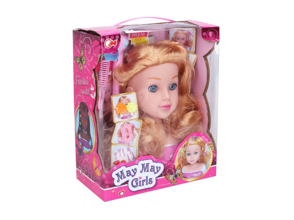 Česacia hlava set. Veľkosť 22 cm. Obsah - hlava, fén, kulma, hrebeň, 2 sponky, gumička.Dodatočné parametre